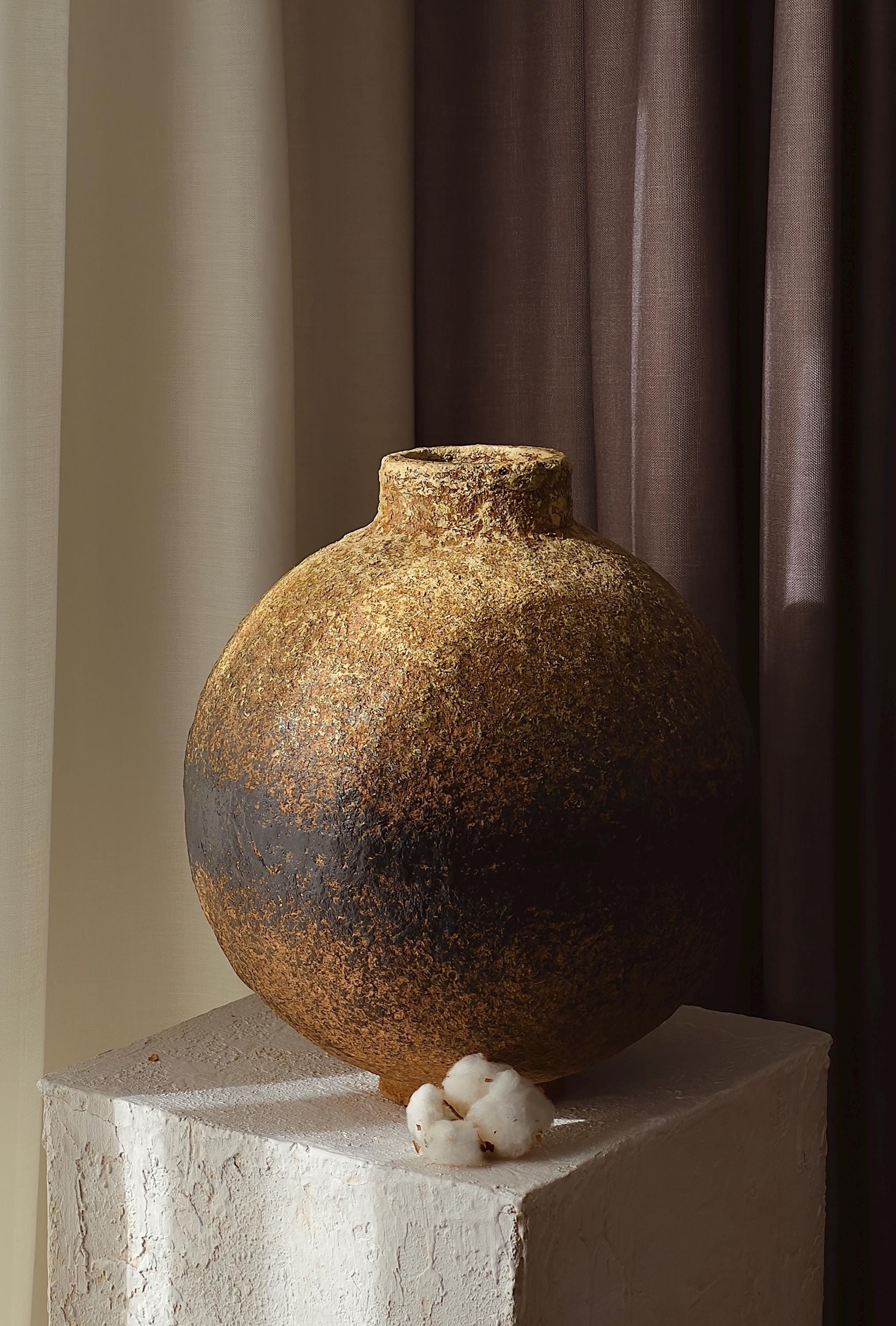 Handmade sculptural vessel in earthy sand and char tones. Organic spherical form in recycled paper clay — a wabi-sabi statement for modern interiors.