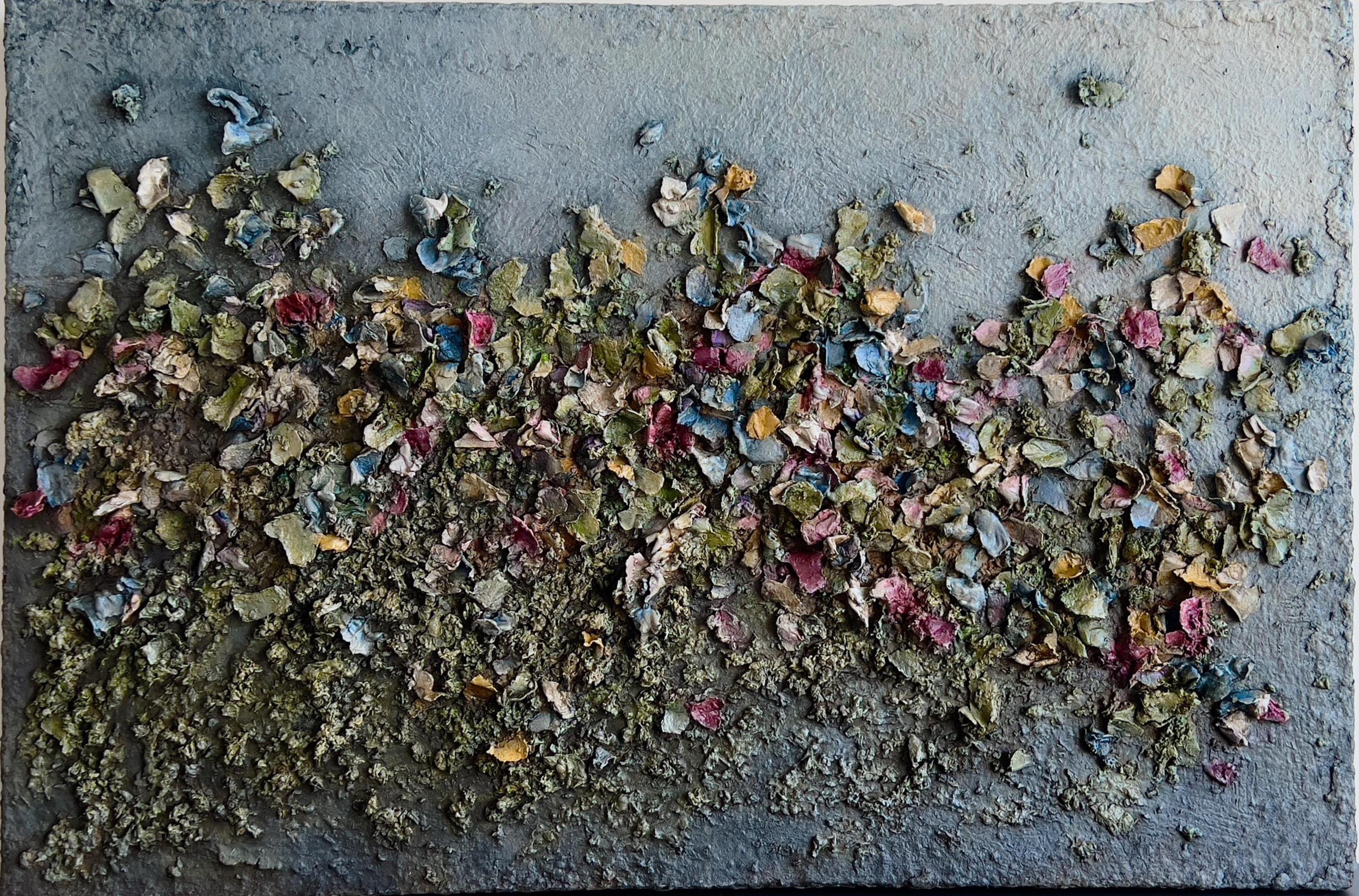 Its surface is sculptural and deeply tactile: paper clay, natural inclusions, and matte acrylic layered into a ground of gray and ash. Across this earth-like field, fragments of muted color — green, ochre, rose, and indigo — scatter like remnants of memory or petals pressed into silence. The darker lower ground holds density, while the upper layers dissolve into mist, evoking depth, distance, and quiet transformation.