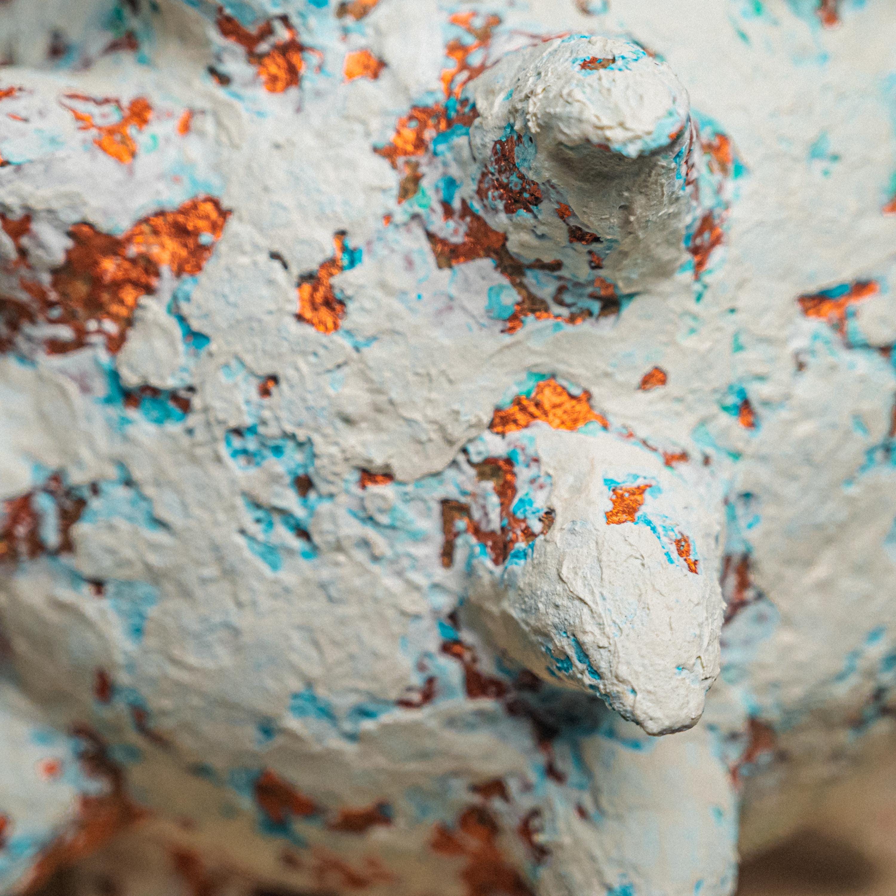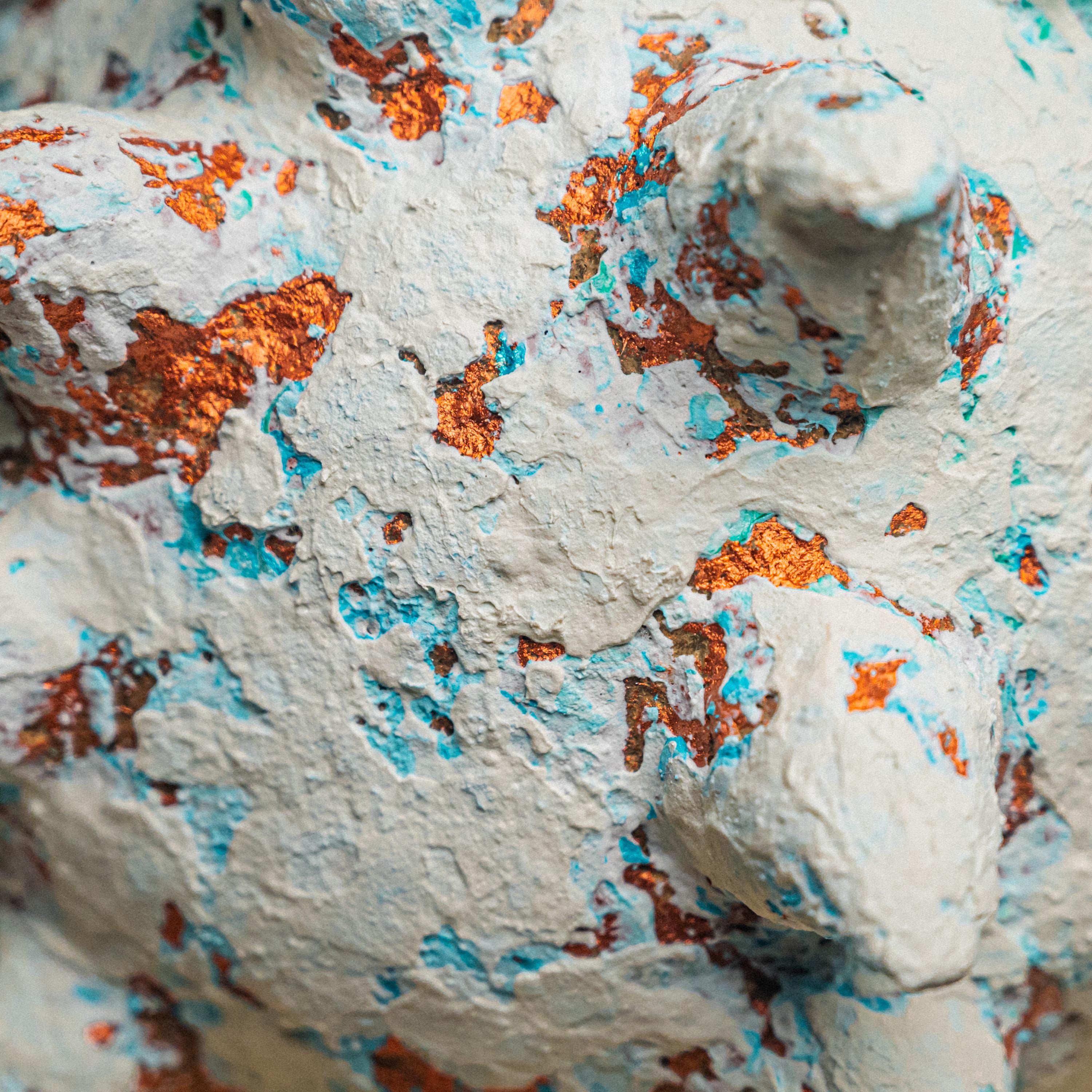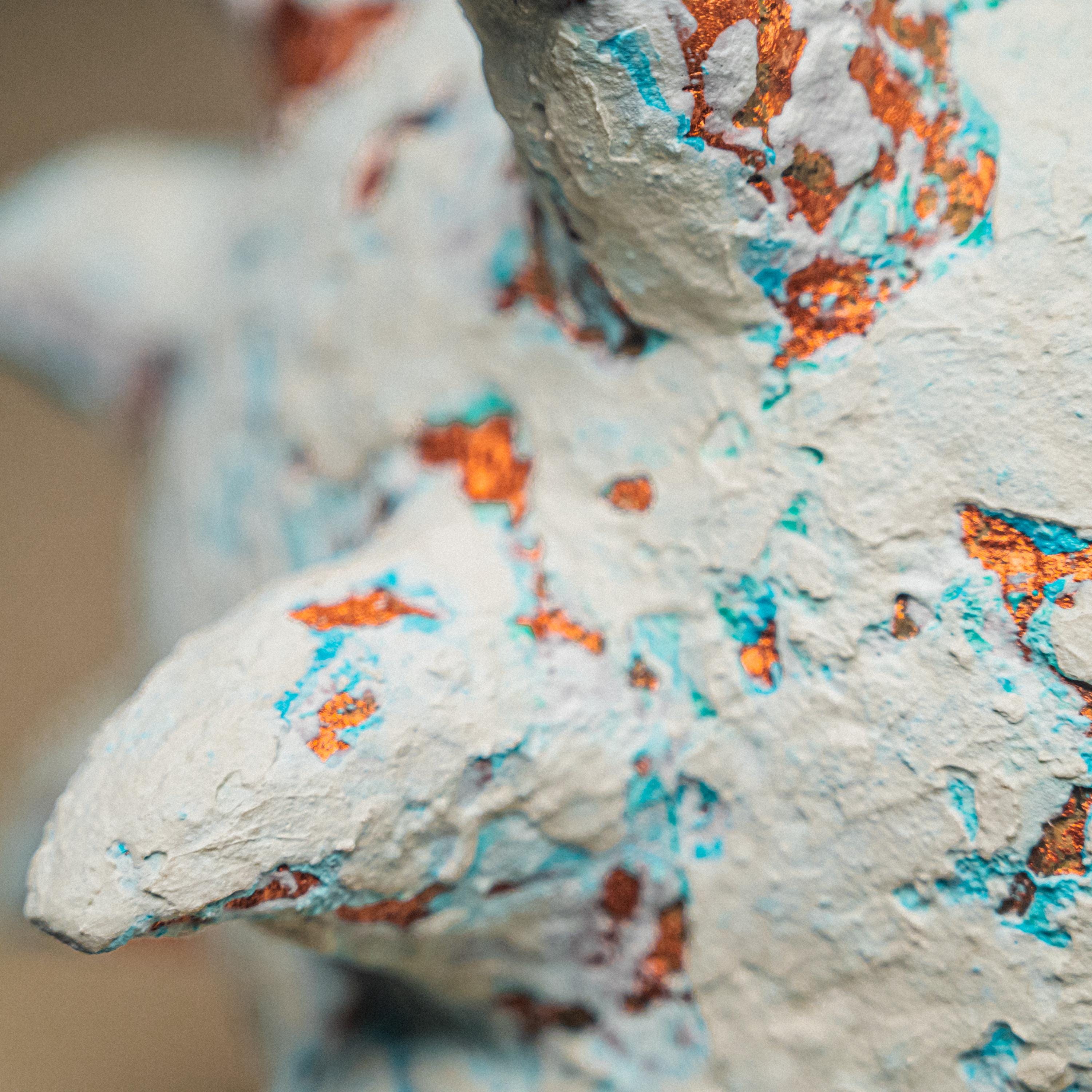 Created from recycled paper clay, natural clay, acrylic pigments, oxidized copper tones, turquoise accents, and matte seal.