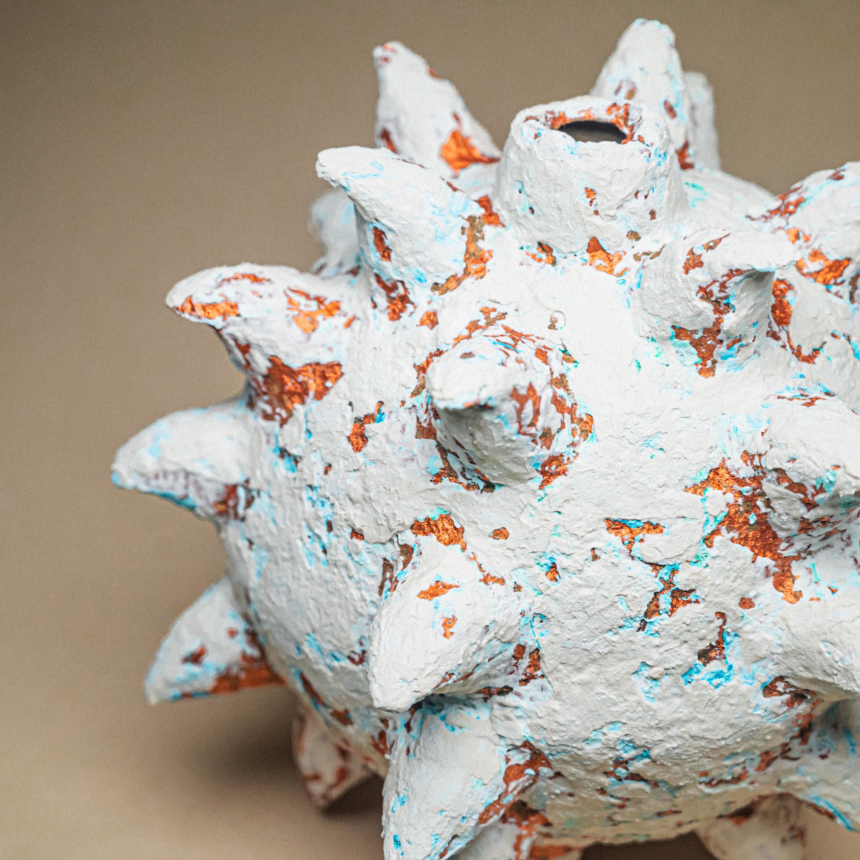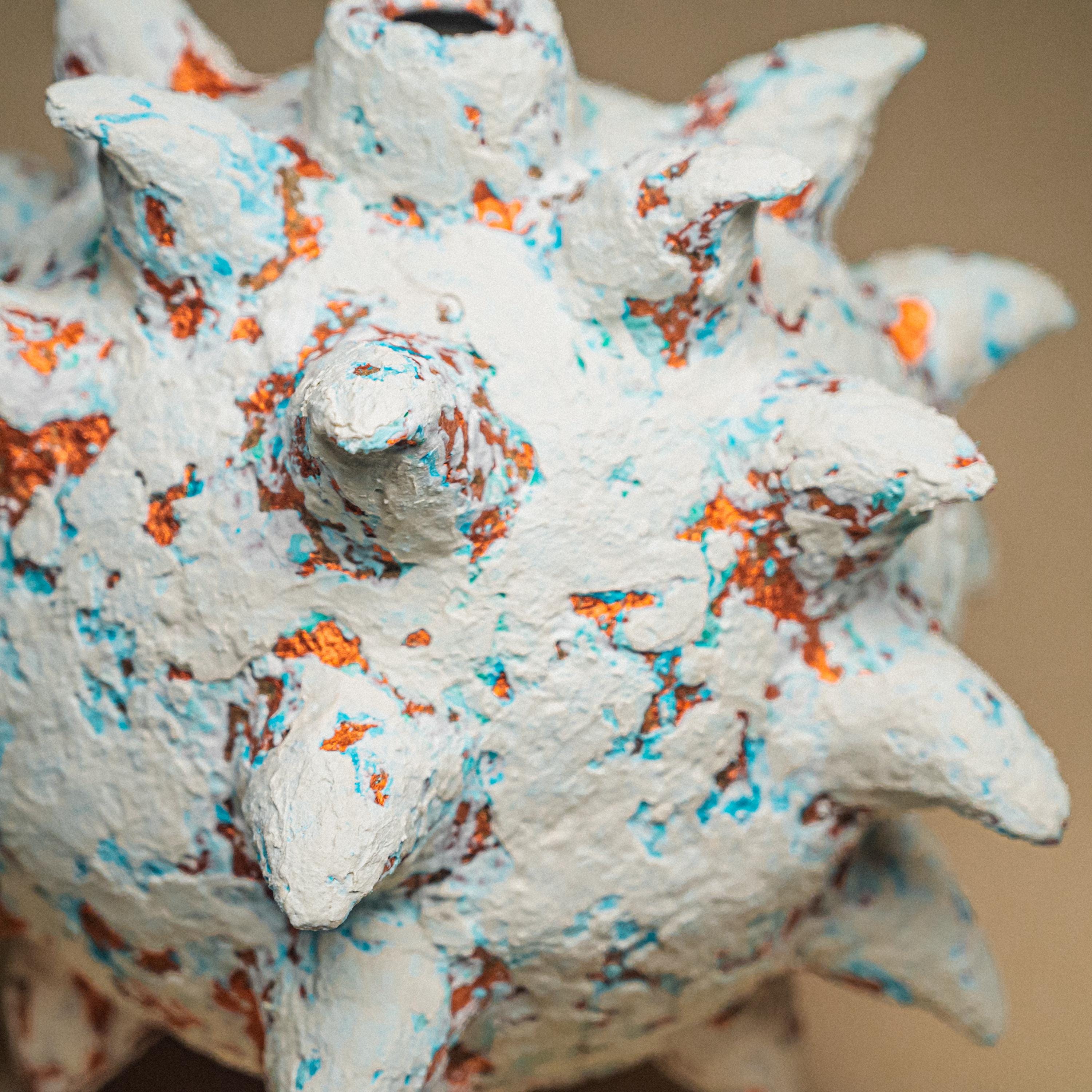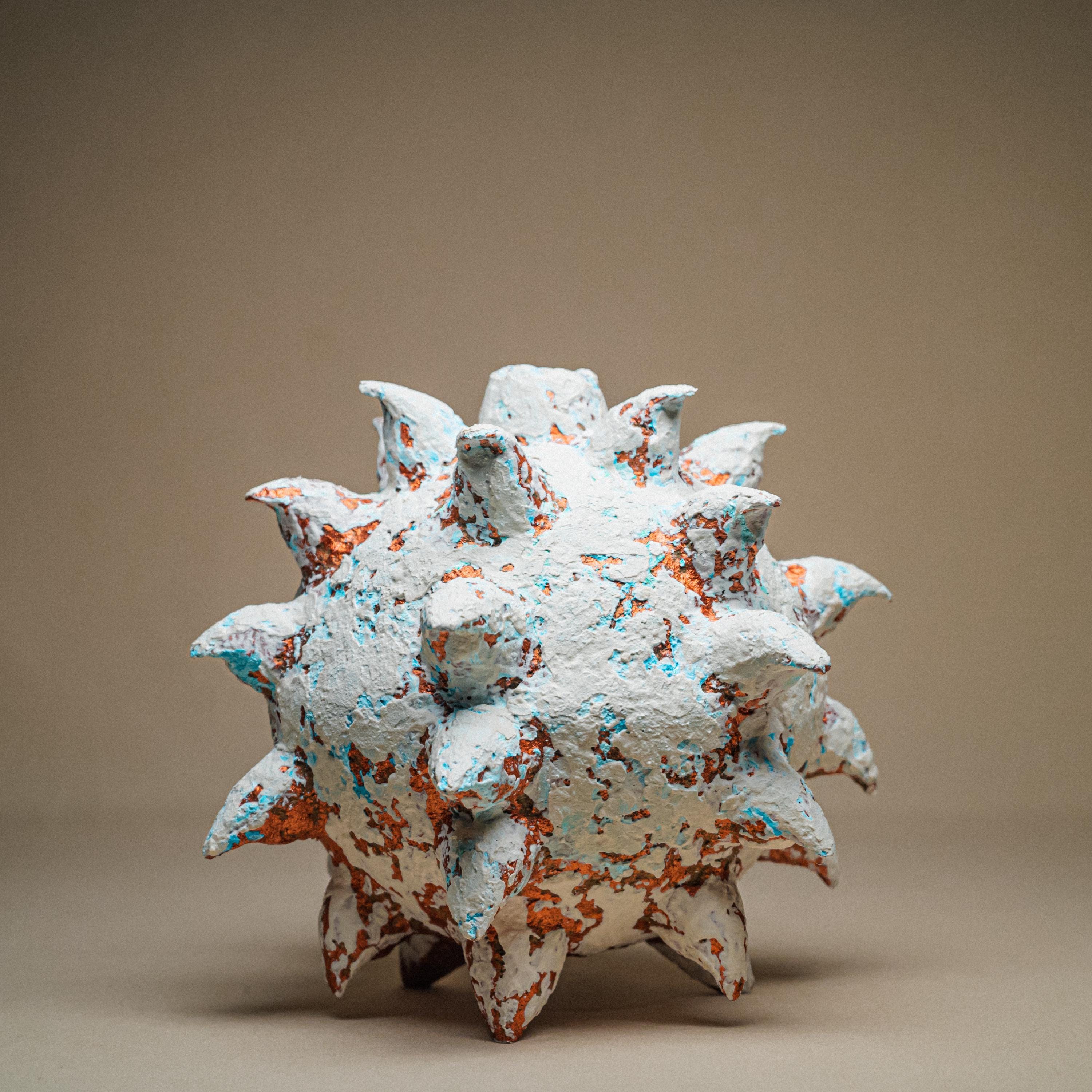 A spiked paper clay sculpture shaped as a biomorphic brutalist centerpiece, where organic form meets eruptive force.