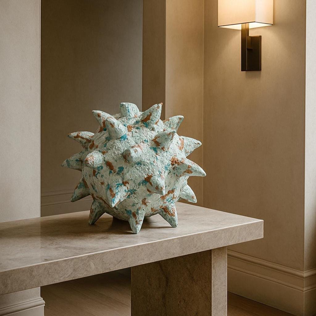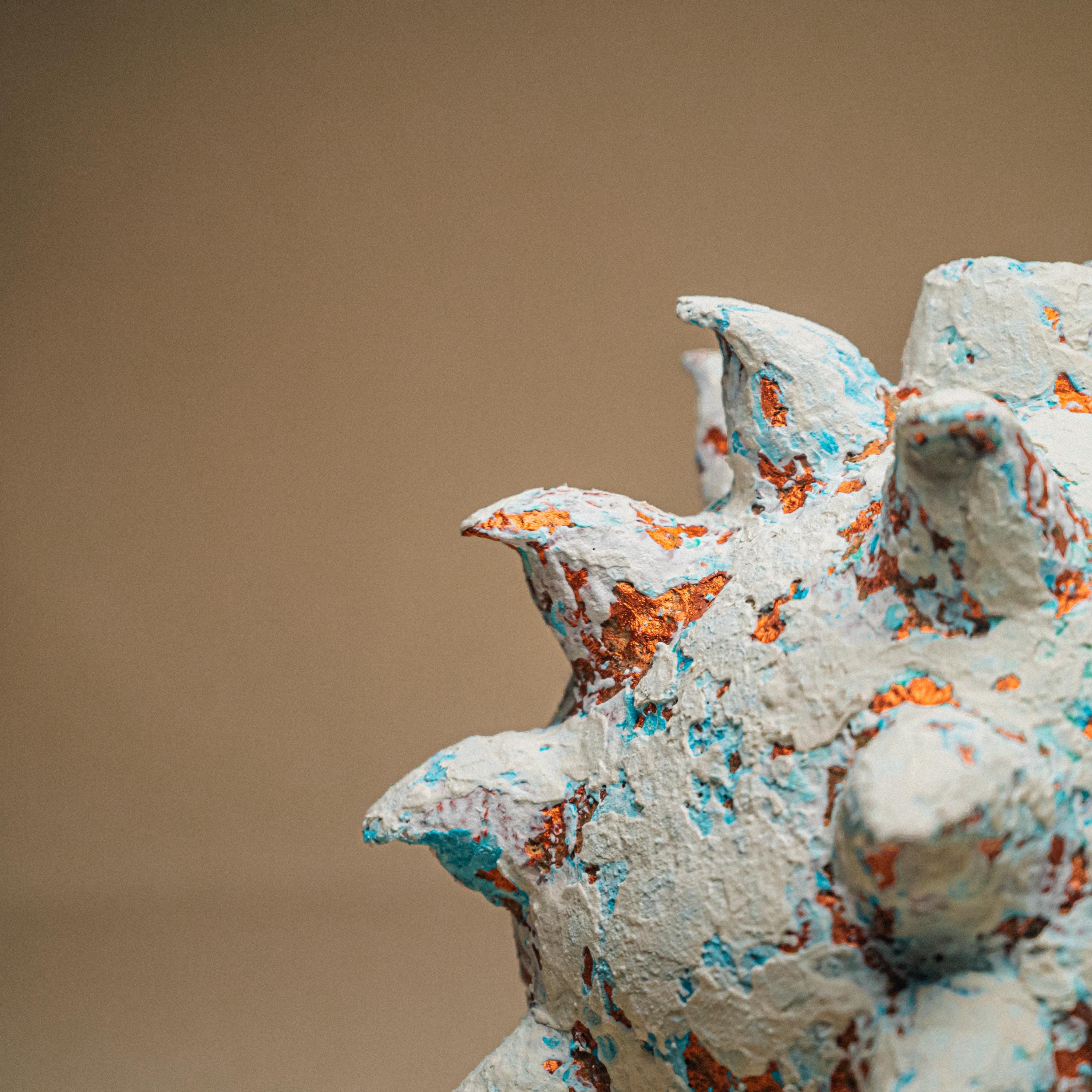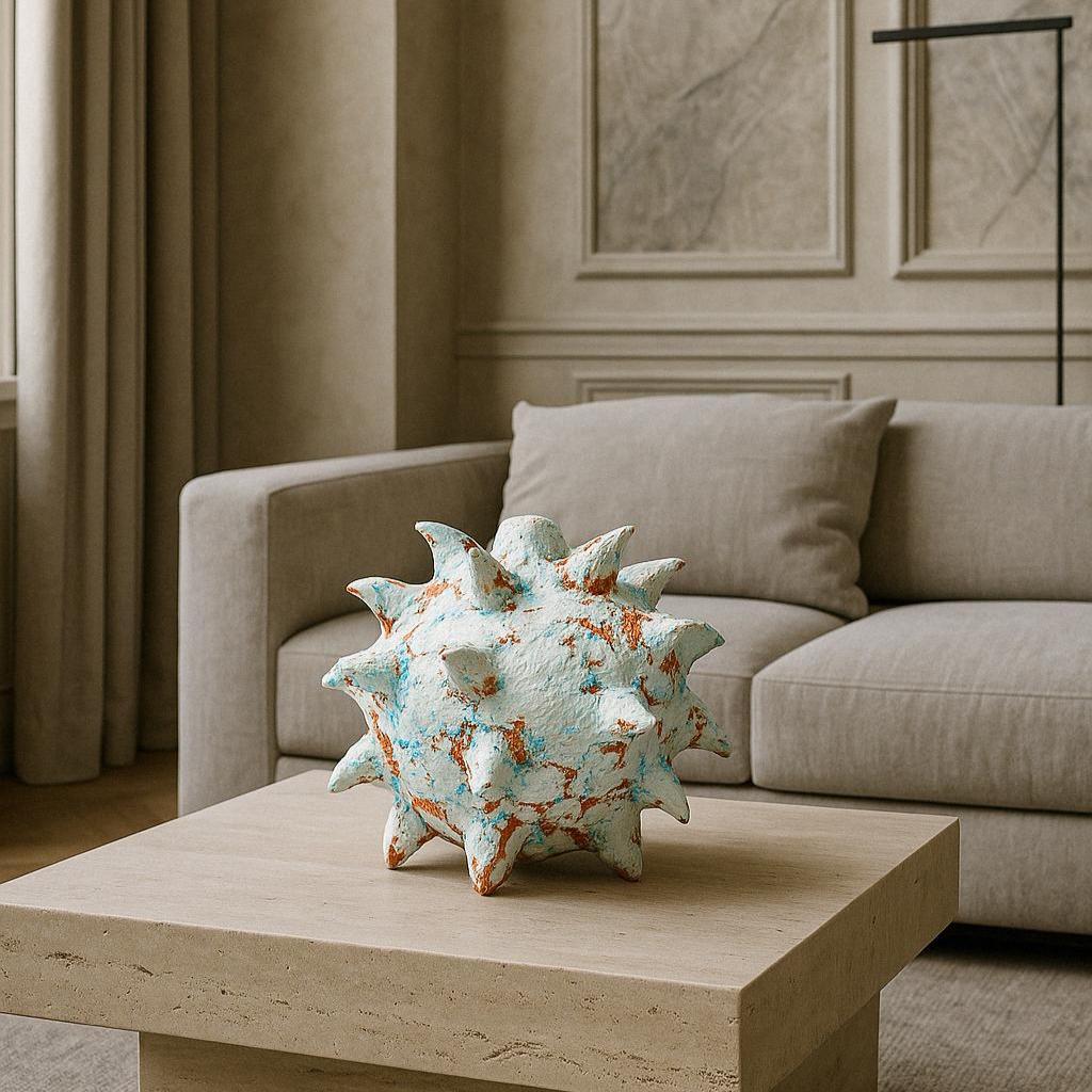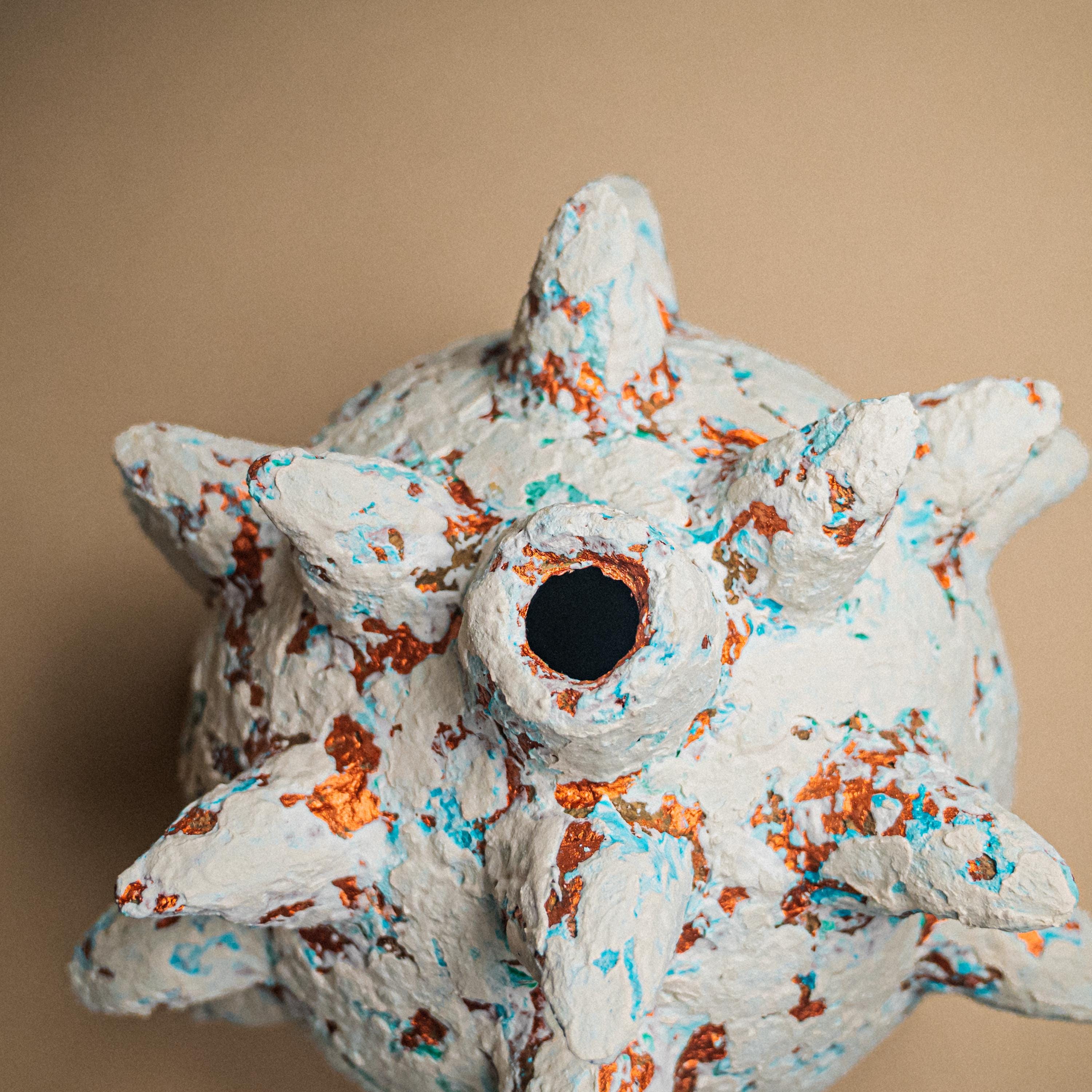 A spiked paper clay sculpture shaped as a biomorphic brutalist centerpiece, where organic form meets eruptive force.
