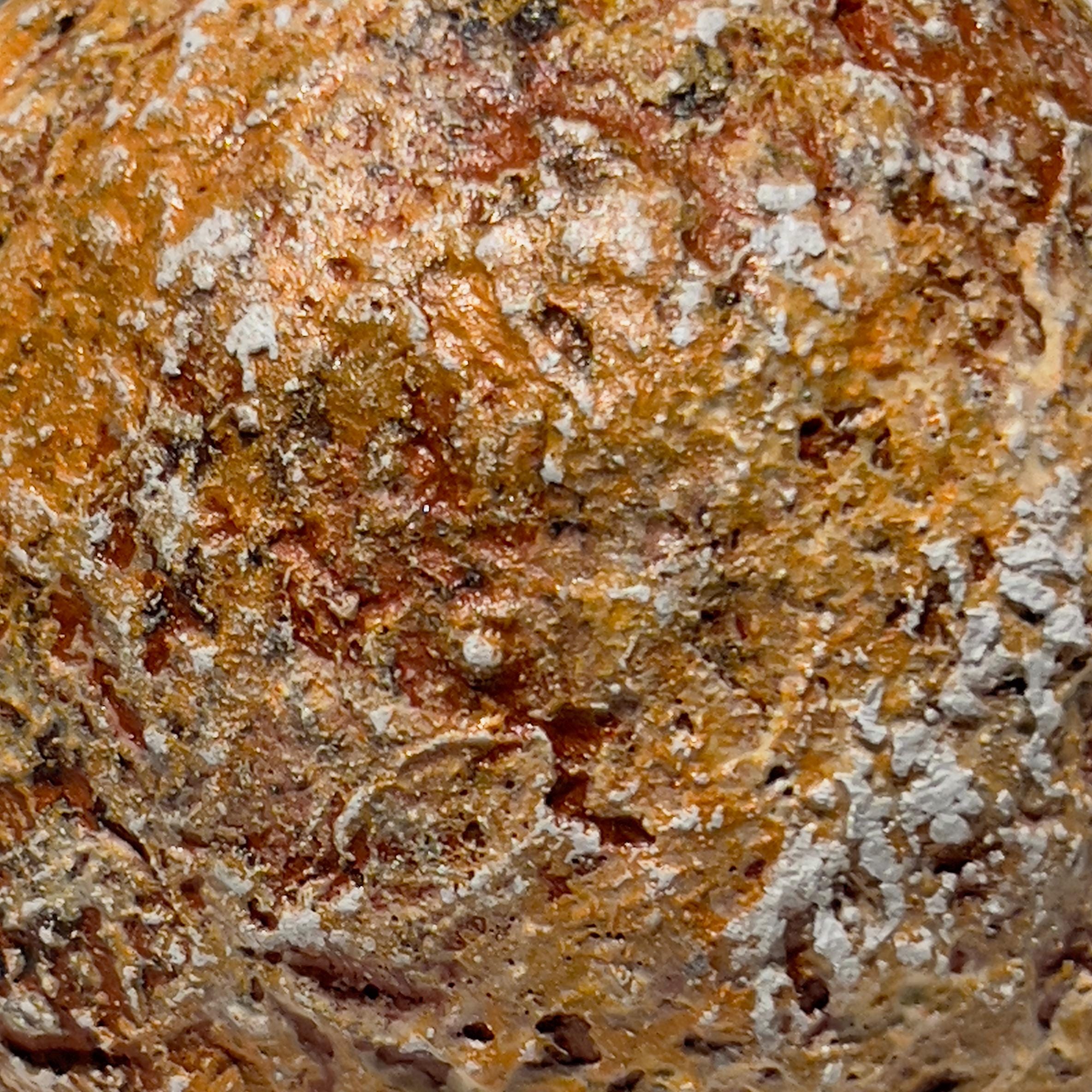 The form reveals traces of its making — compressed fibers, natural fractures, and soft tonal shifts of golden ochre, copper-warm browns, muted whites, and ashen greys.