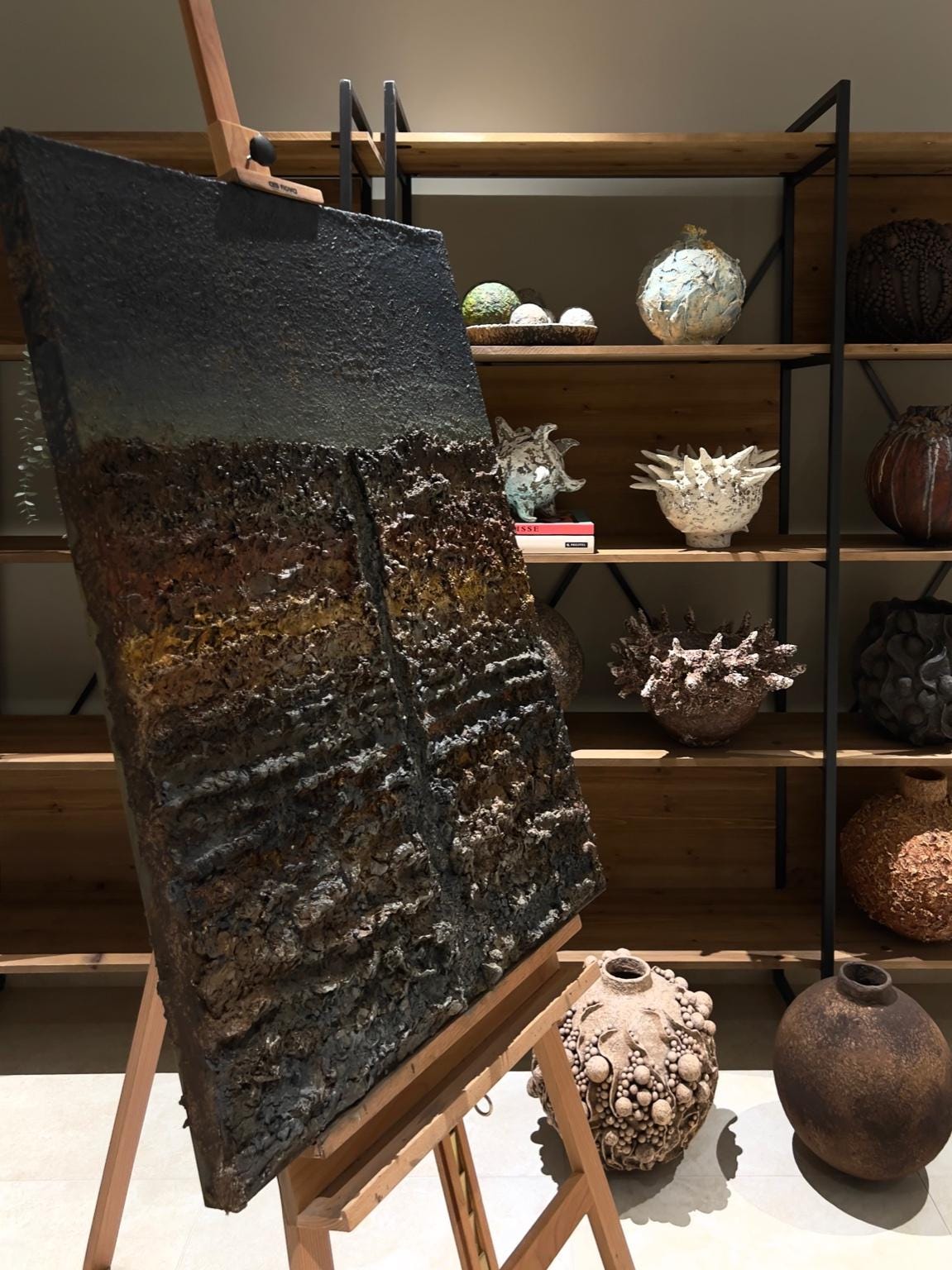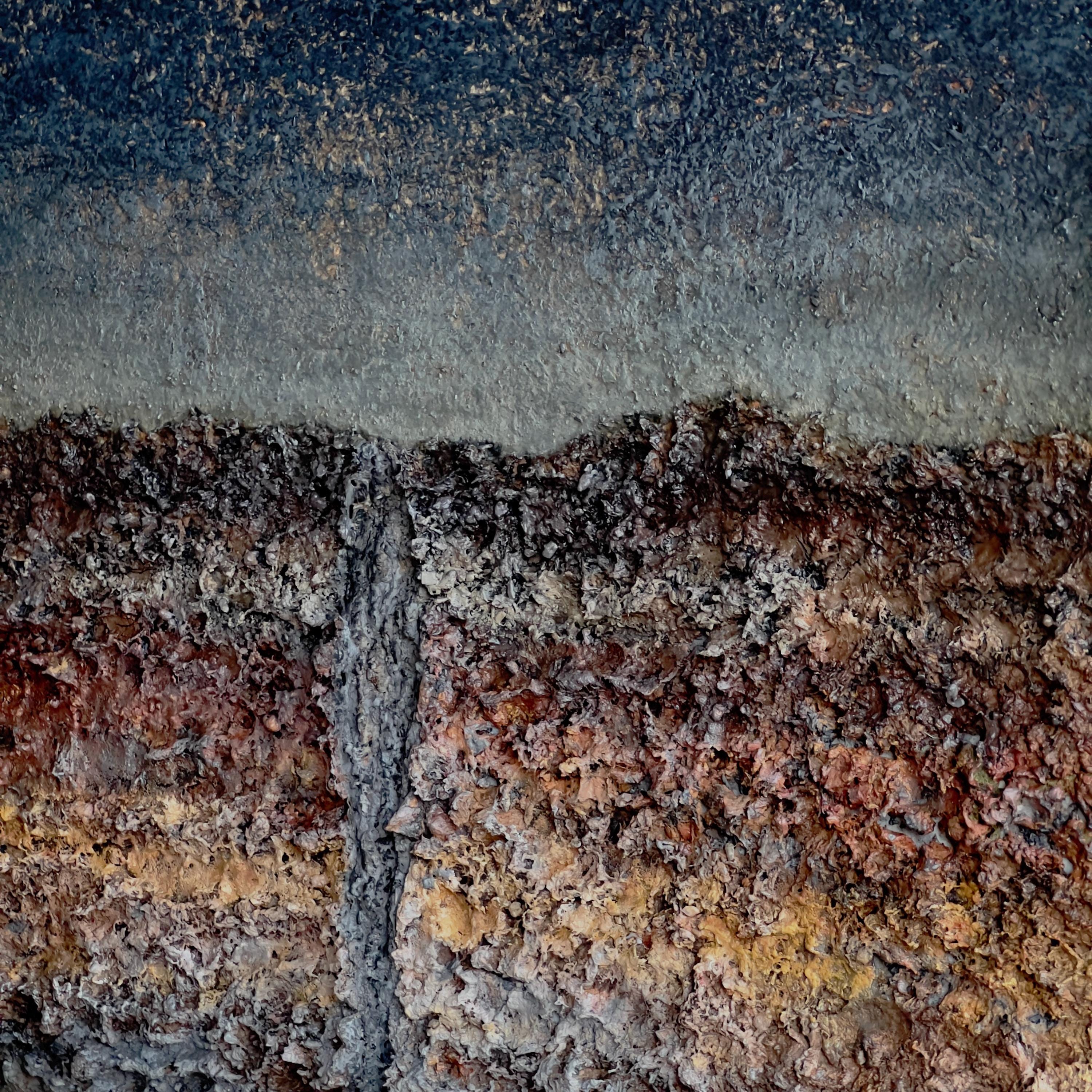 A contemporary textured mixed media painting with a sculptural surface built from paper clay, natural clay, pigments, and acrylic layers.