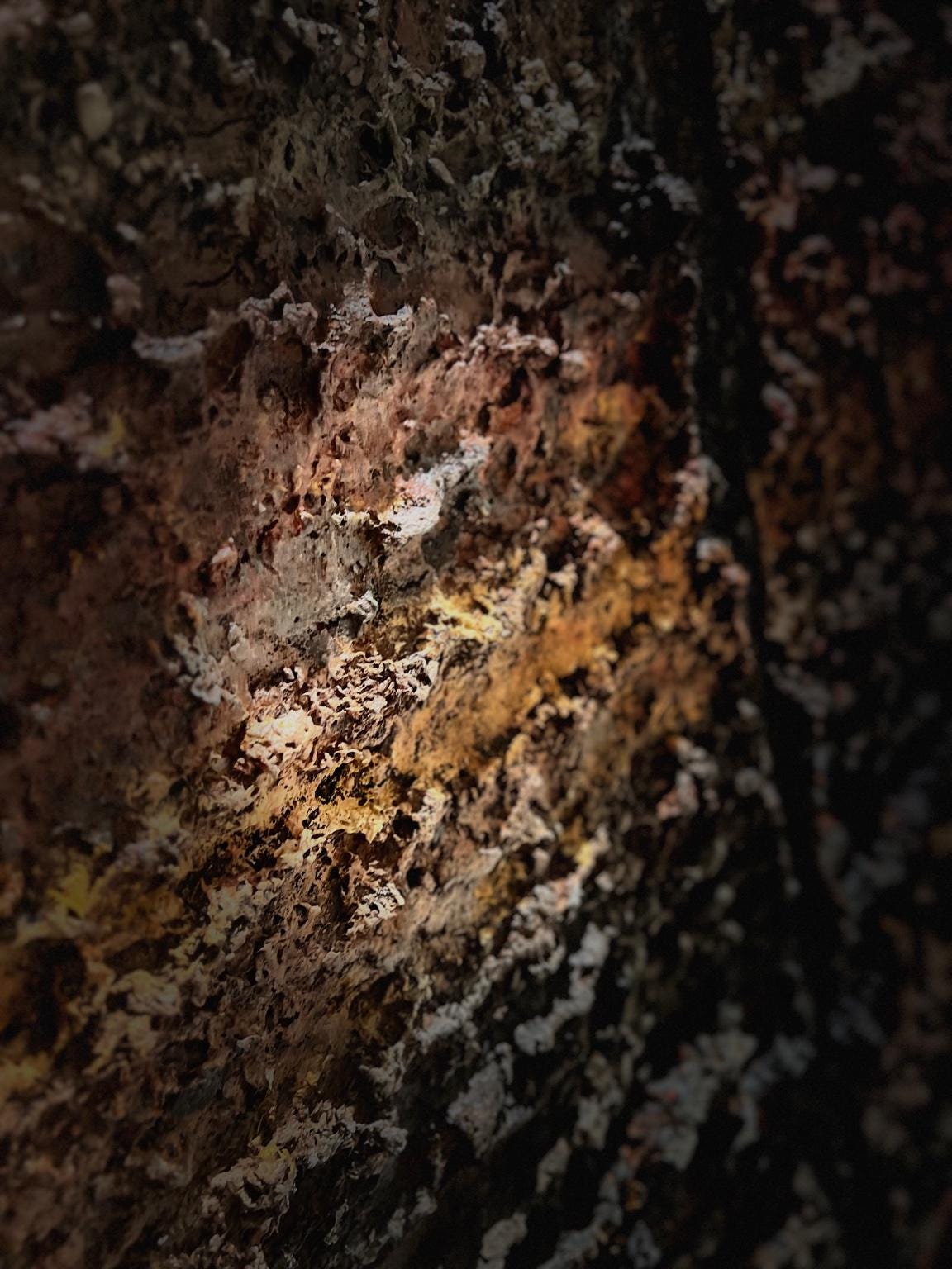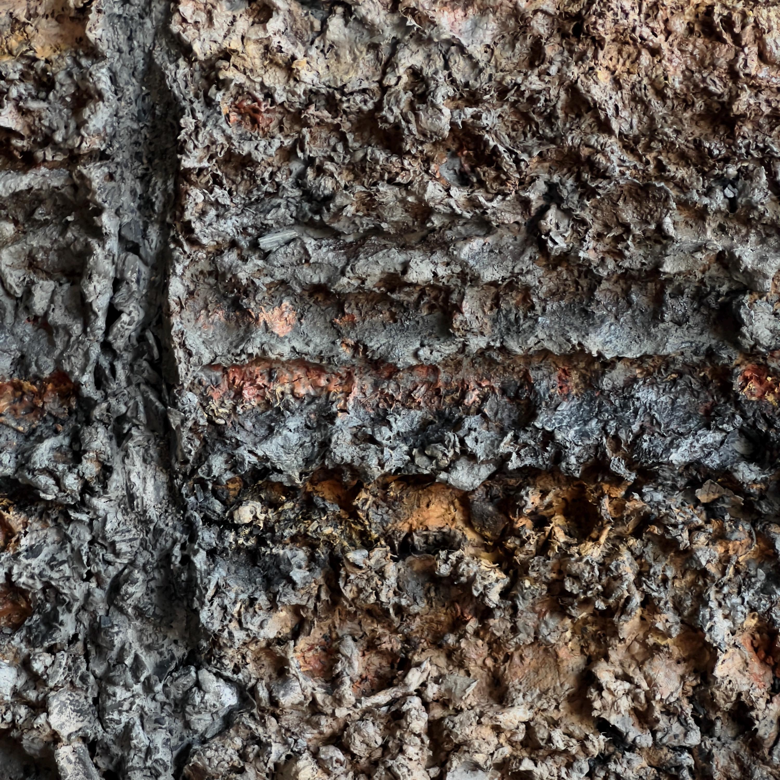 Layered with pigments and acrylic paint, incorporating charcoal and ash.
