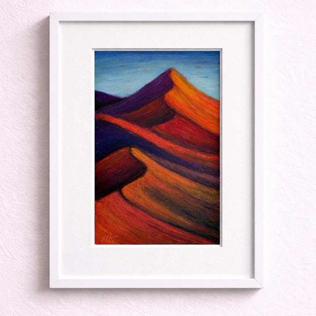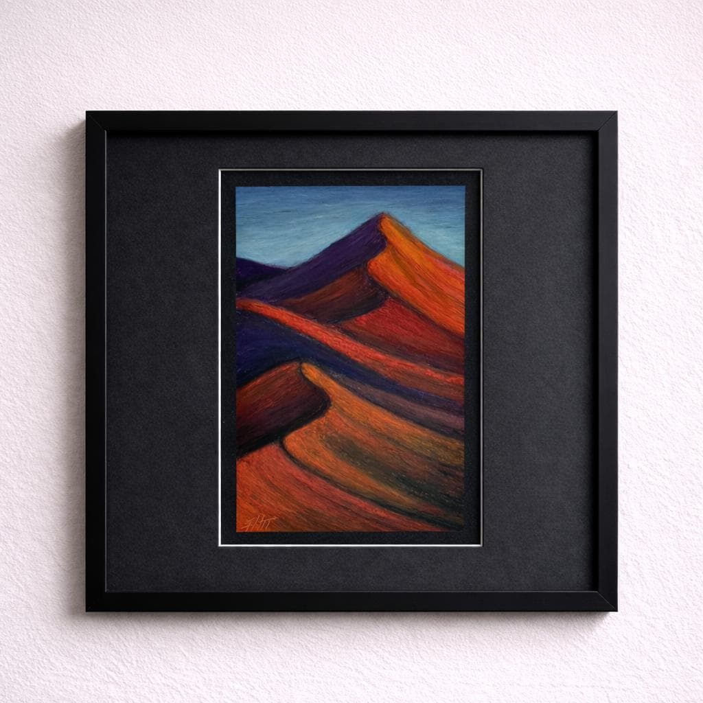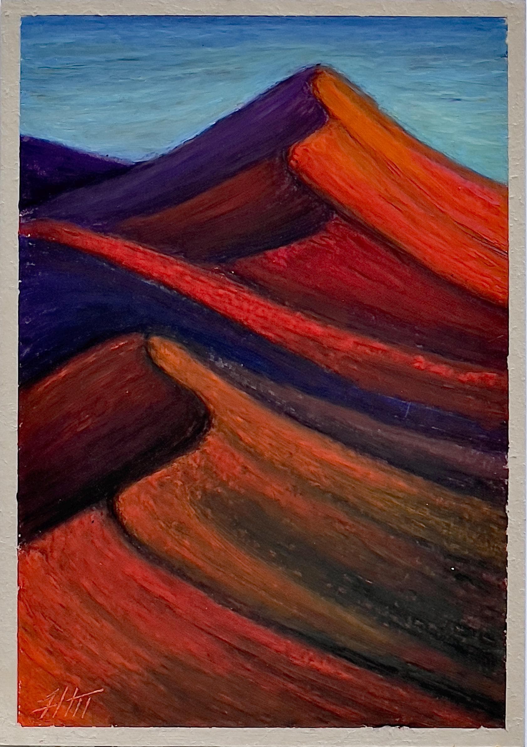 A small semi-abstract landscape artwork created in oil pastel and pigments on paper, focusing on atmosphere rather than depiction.