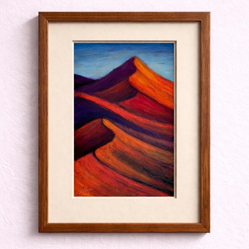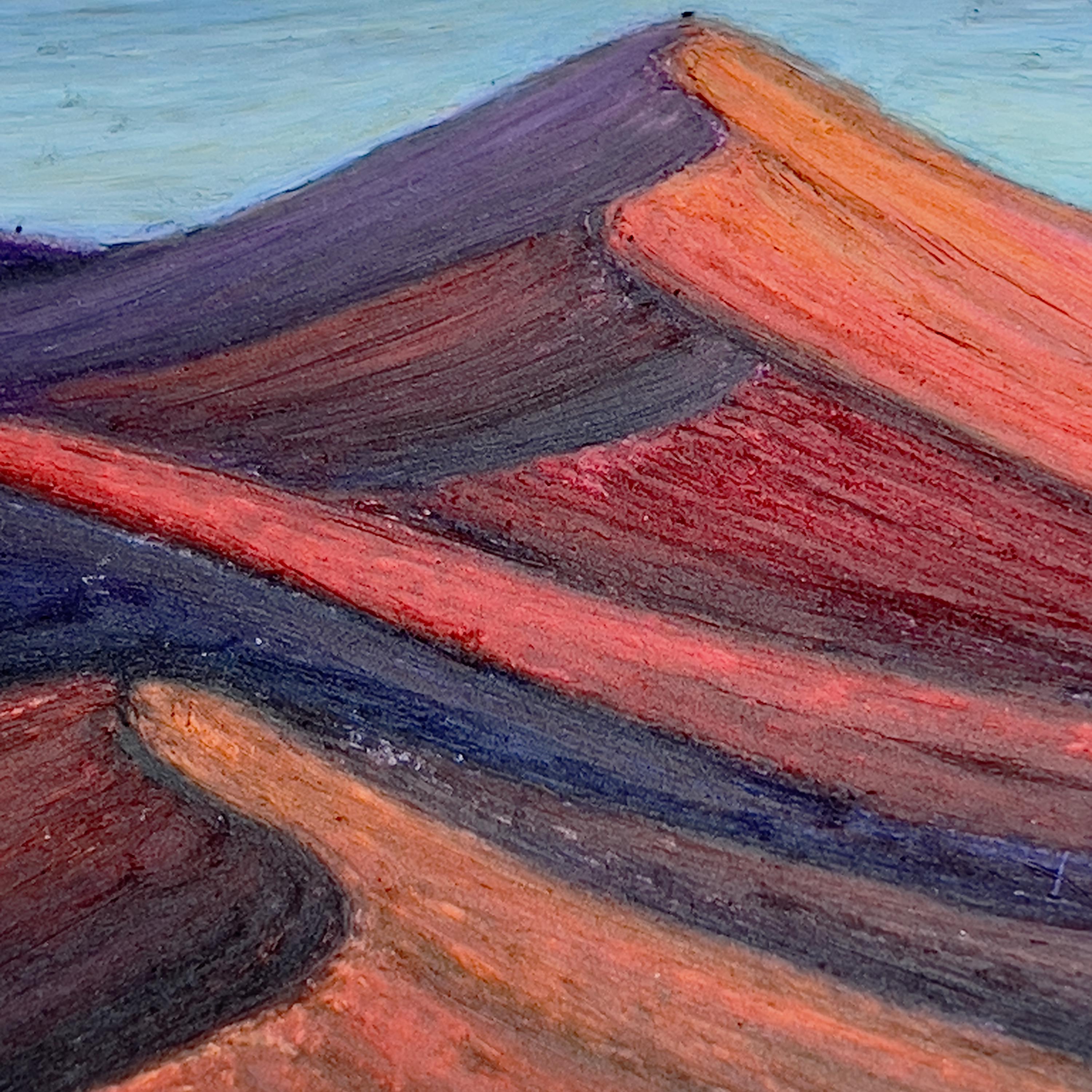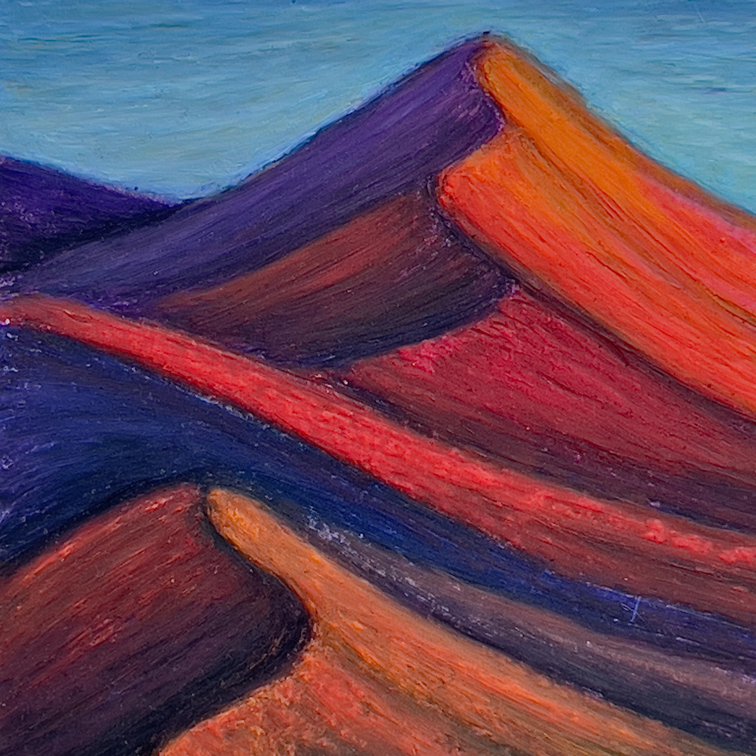 A small semi-abstract landscape artwork created in oil pastel and pigments on paper, focusing on atmosphere rather than depiction.