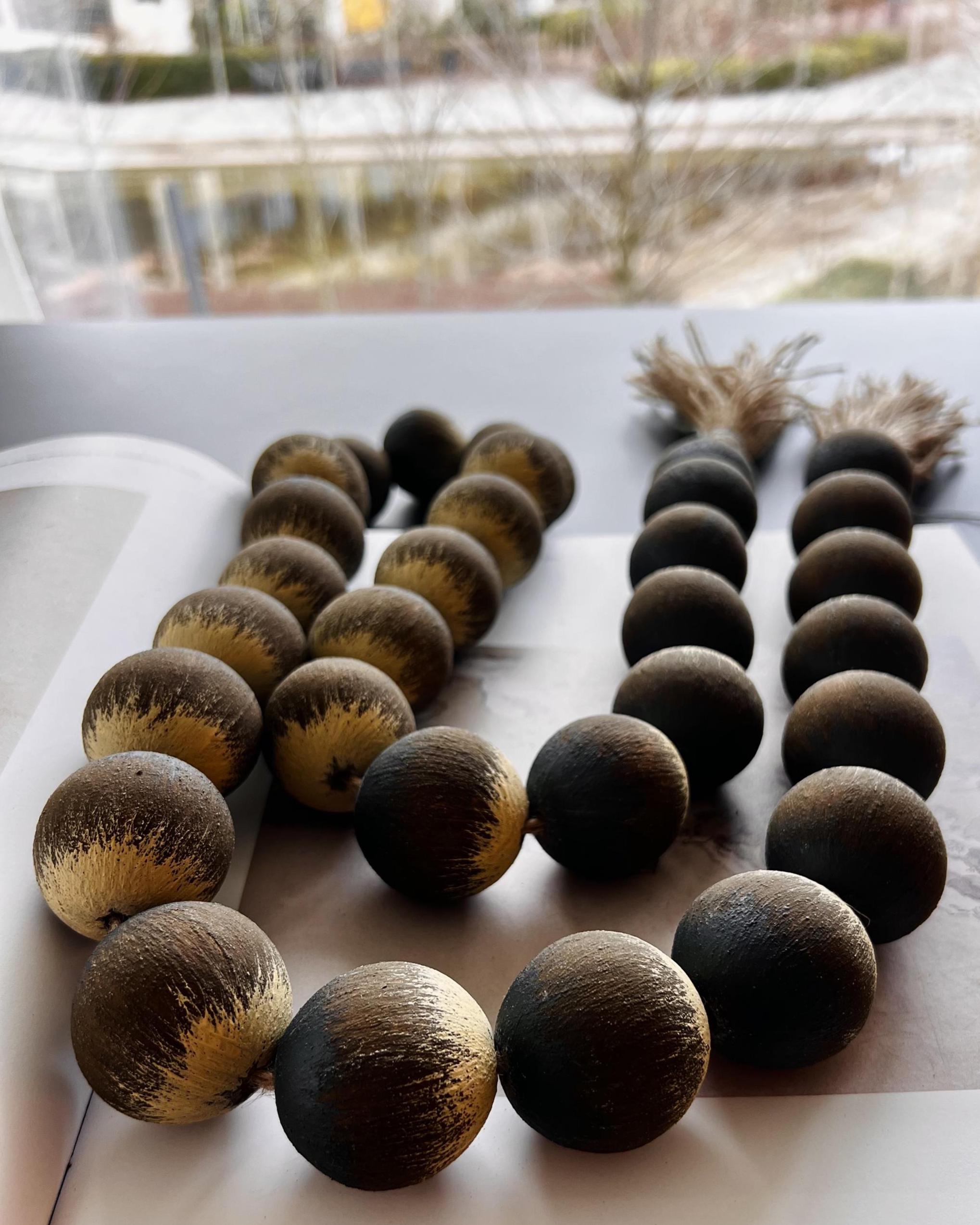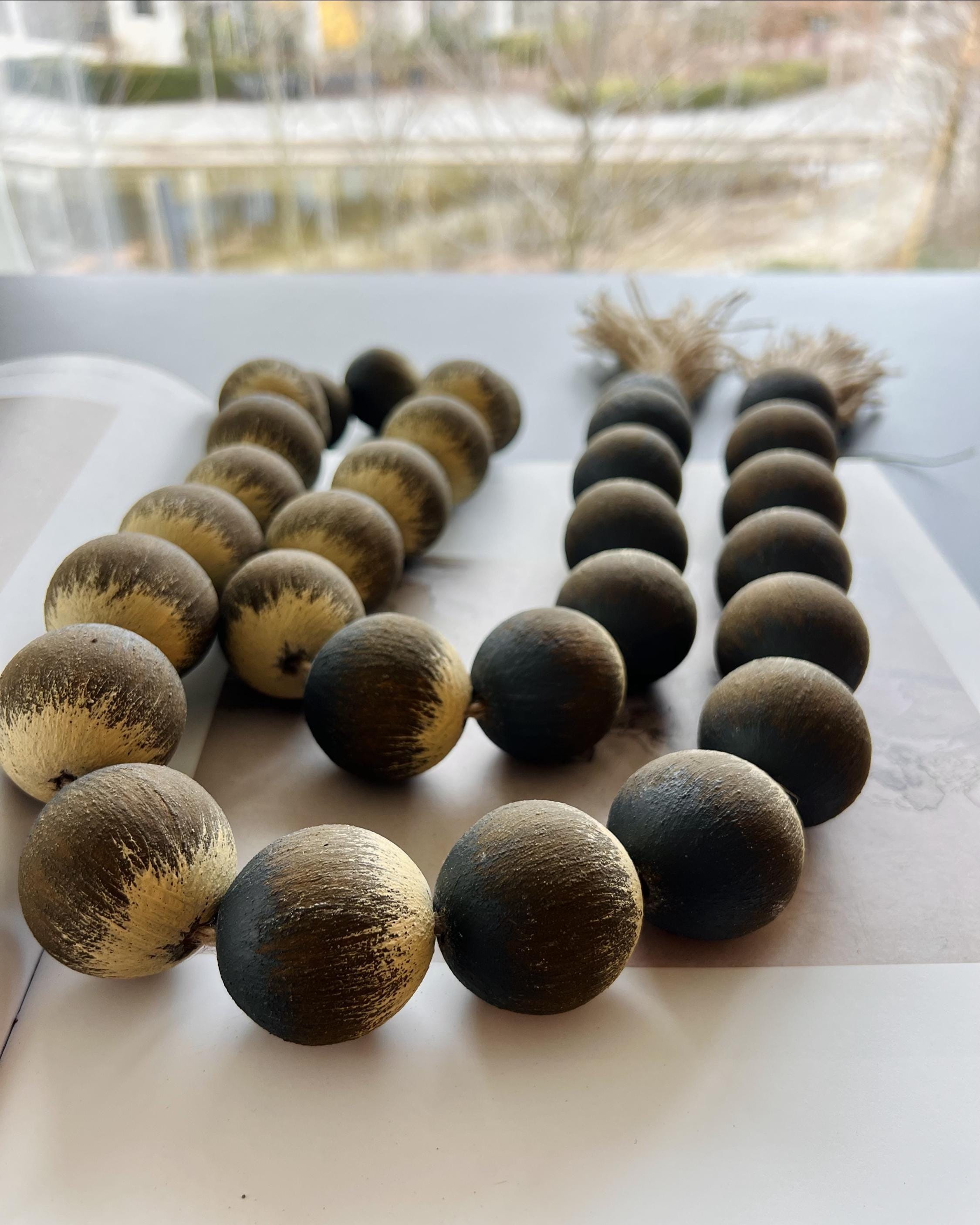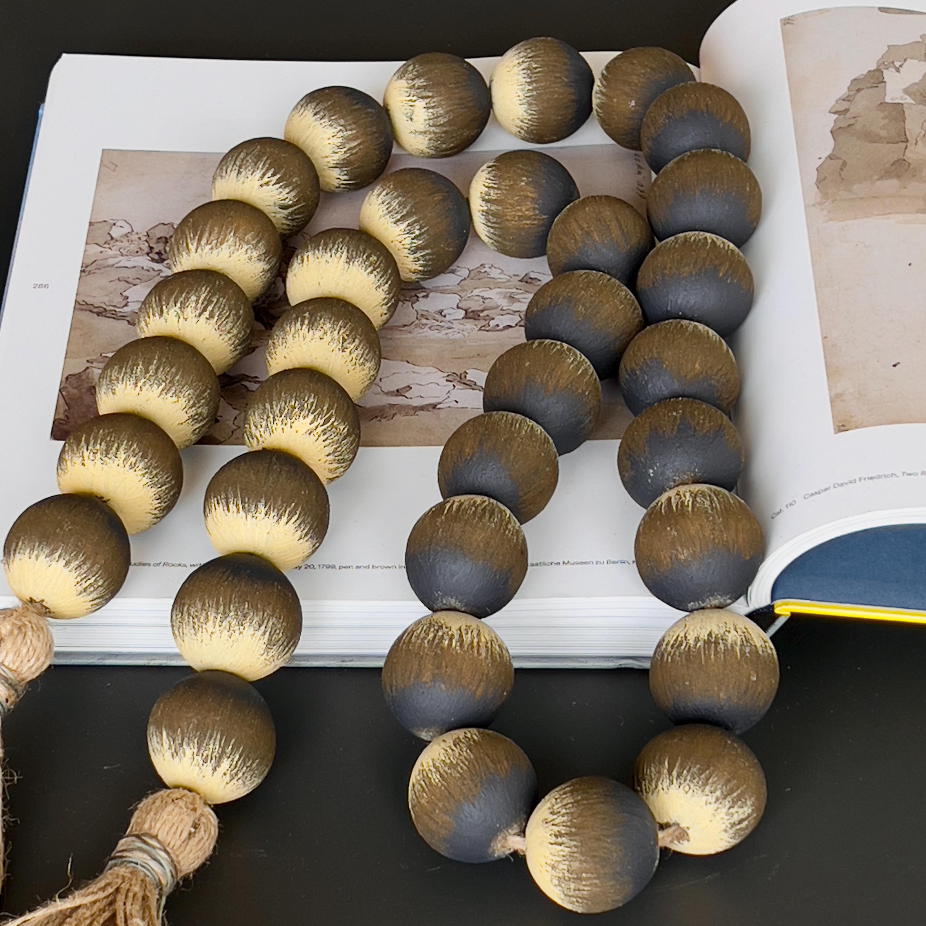 Large wood bead garland with tassel designed for rustic farmhouse and Scandi interiors. A natural earth tone decor accent for shelf styling, coffee tables, and calm living spaces.