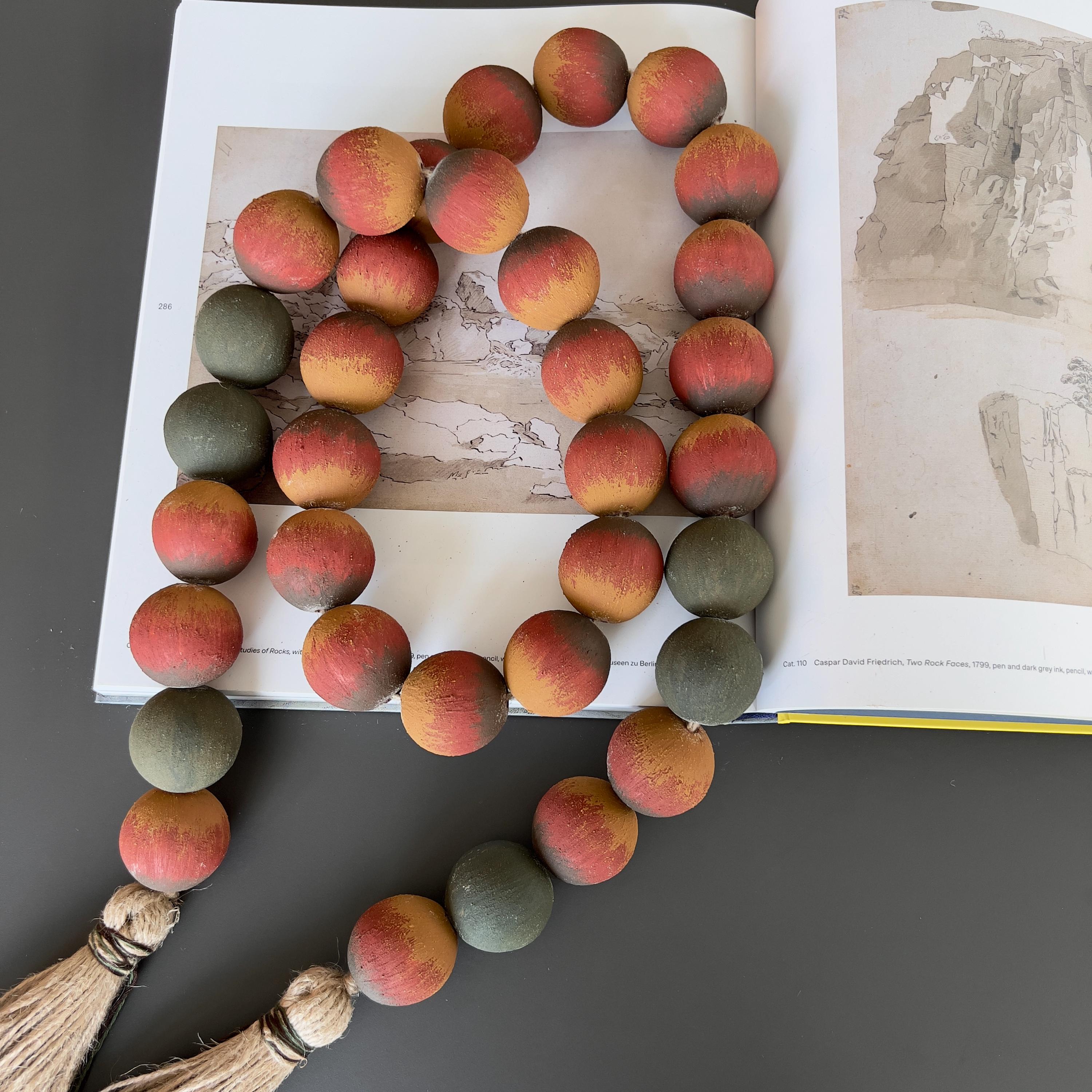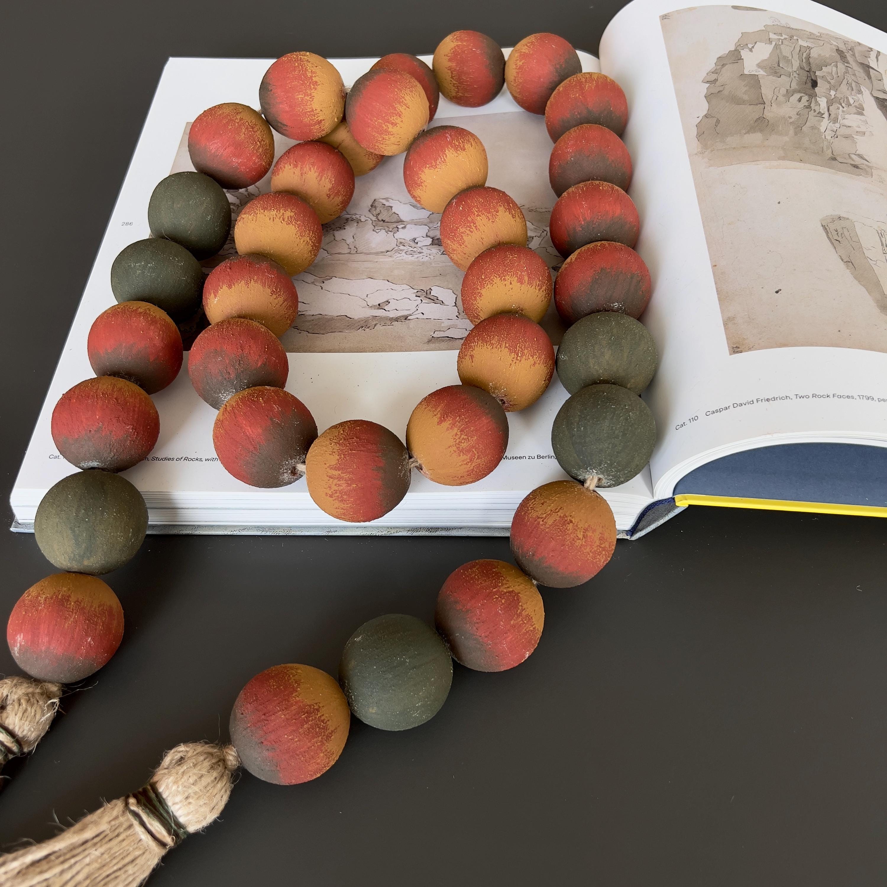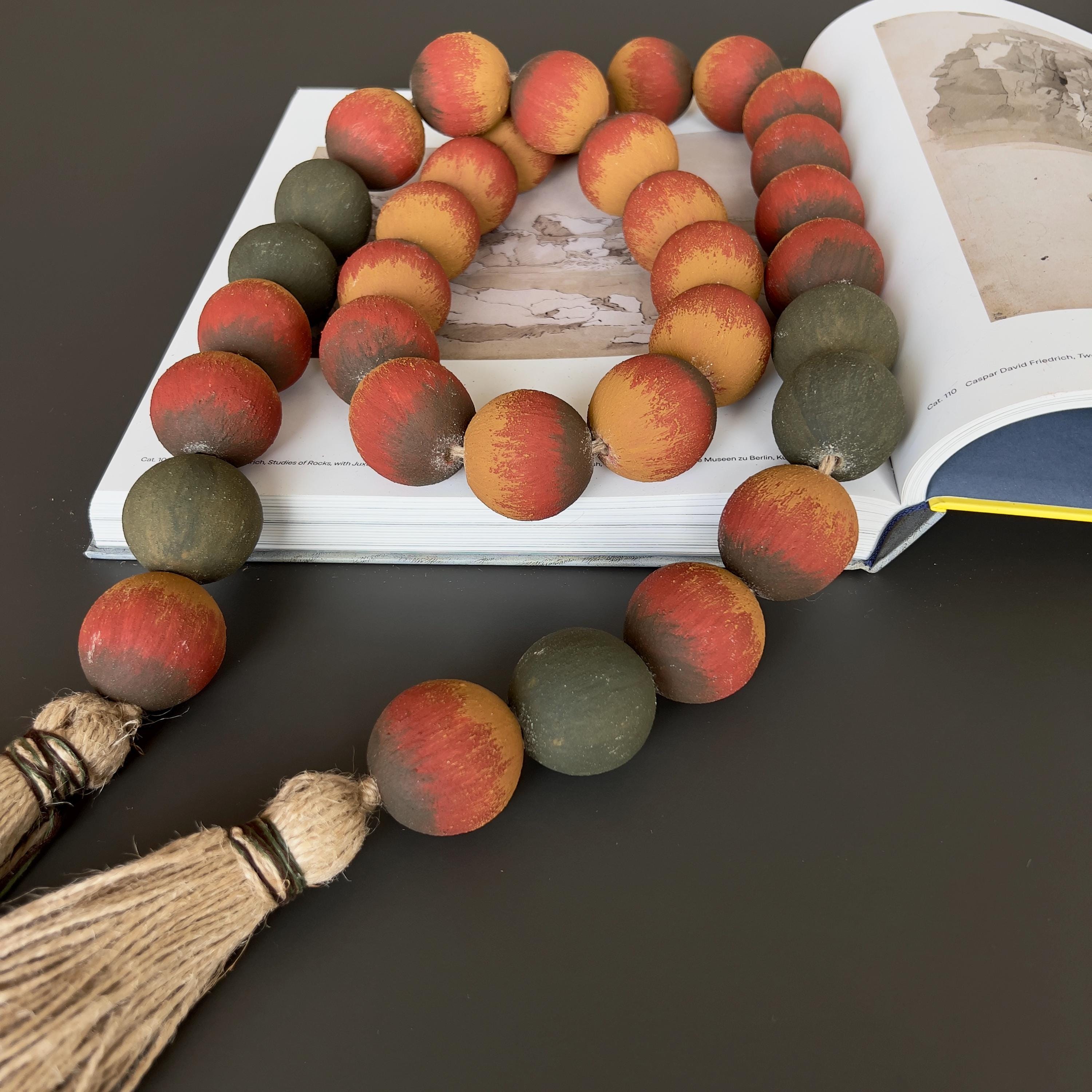 Large wood beads garland with jute tassel in warm terracotta, ochre, and muted dark green tones. Rustic farmhouse and bohemian decor accent for shelf styling and coffee tables.