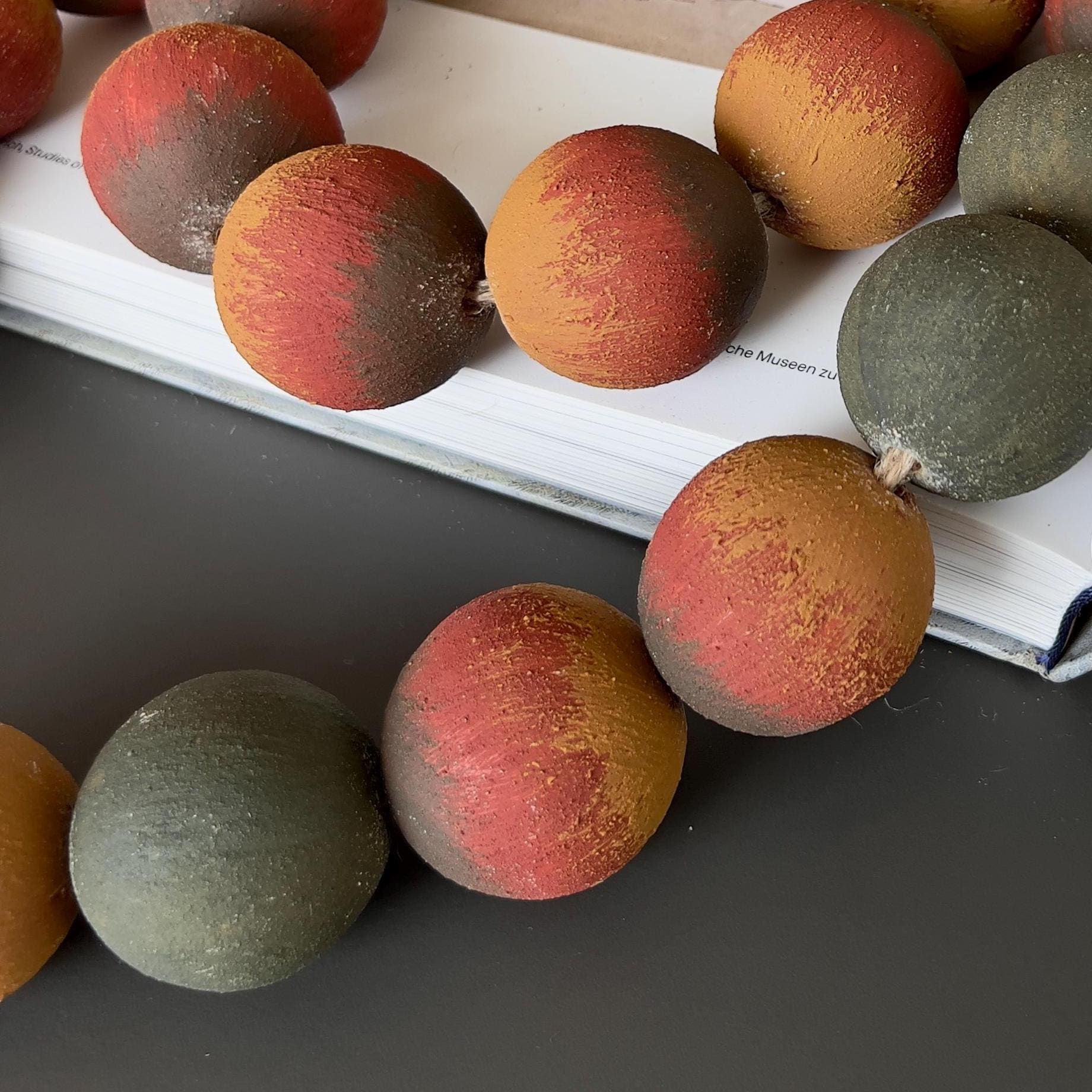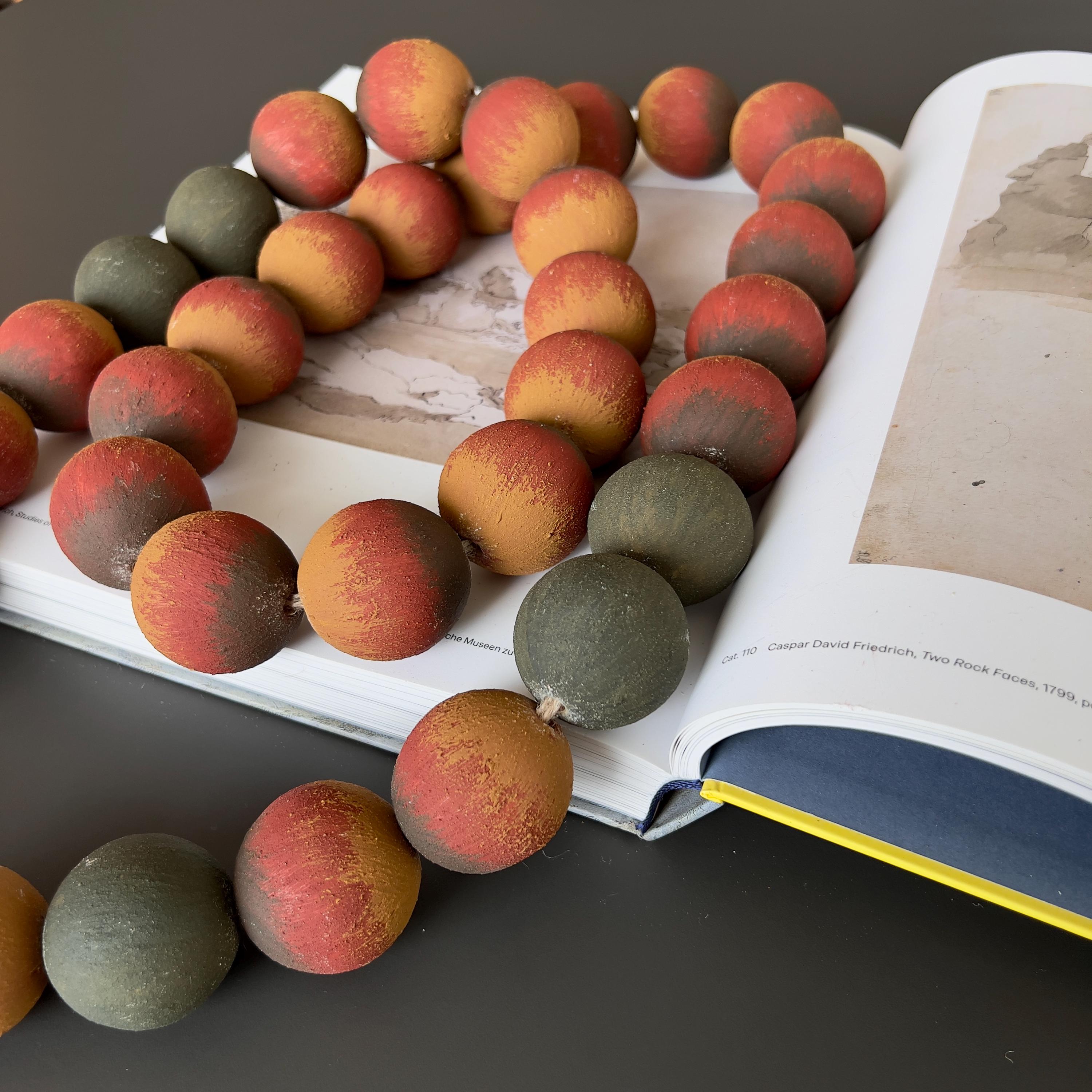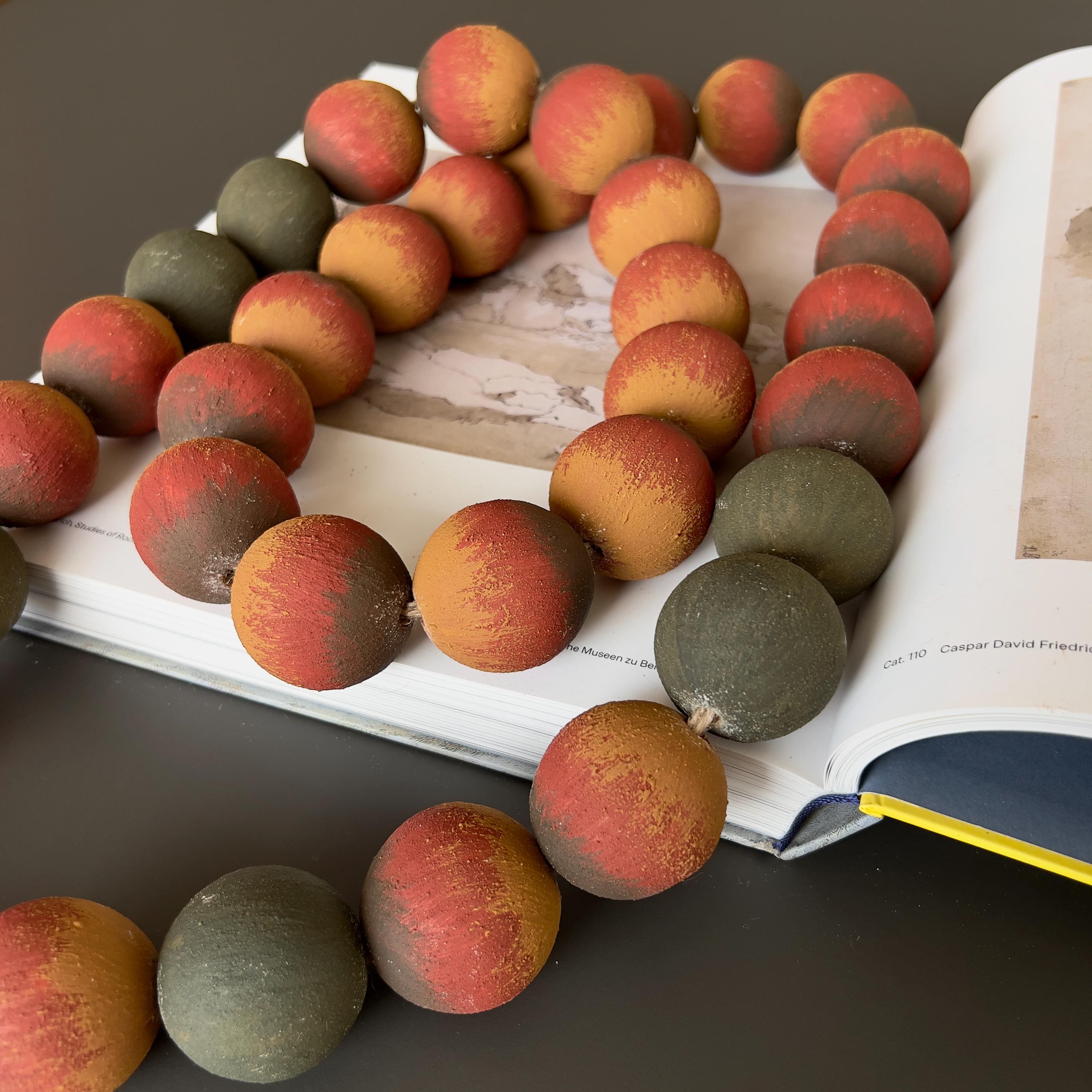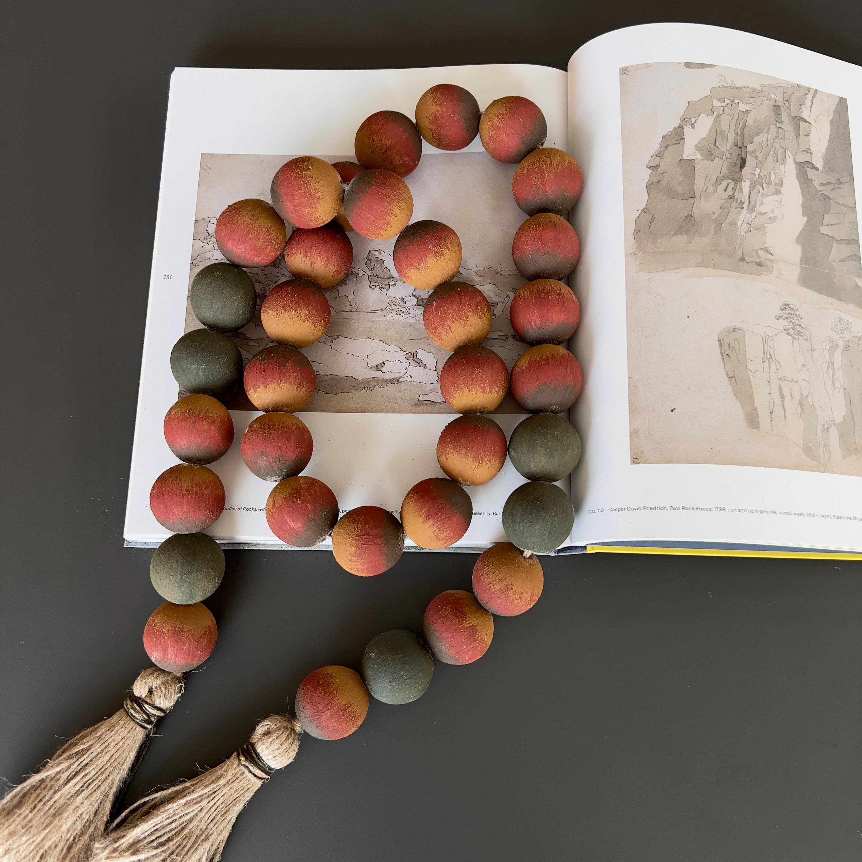 Large wood beads garland with jute tassel in warm terracotta, ochre, and muted dark green tones. Rustic farmhouse and bohemian decor accent for shelf styling and coffee tables.