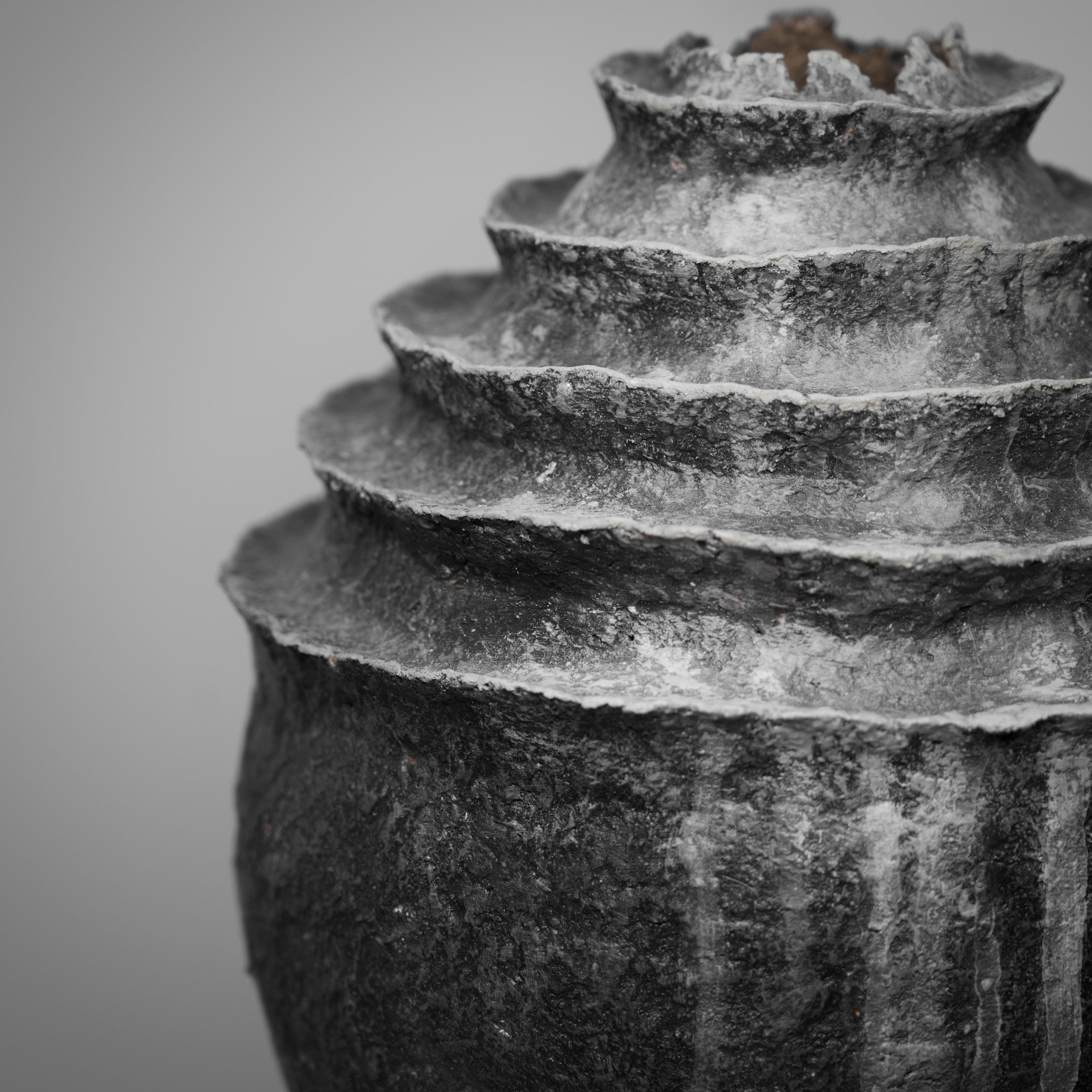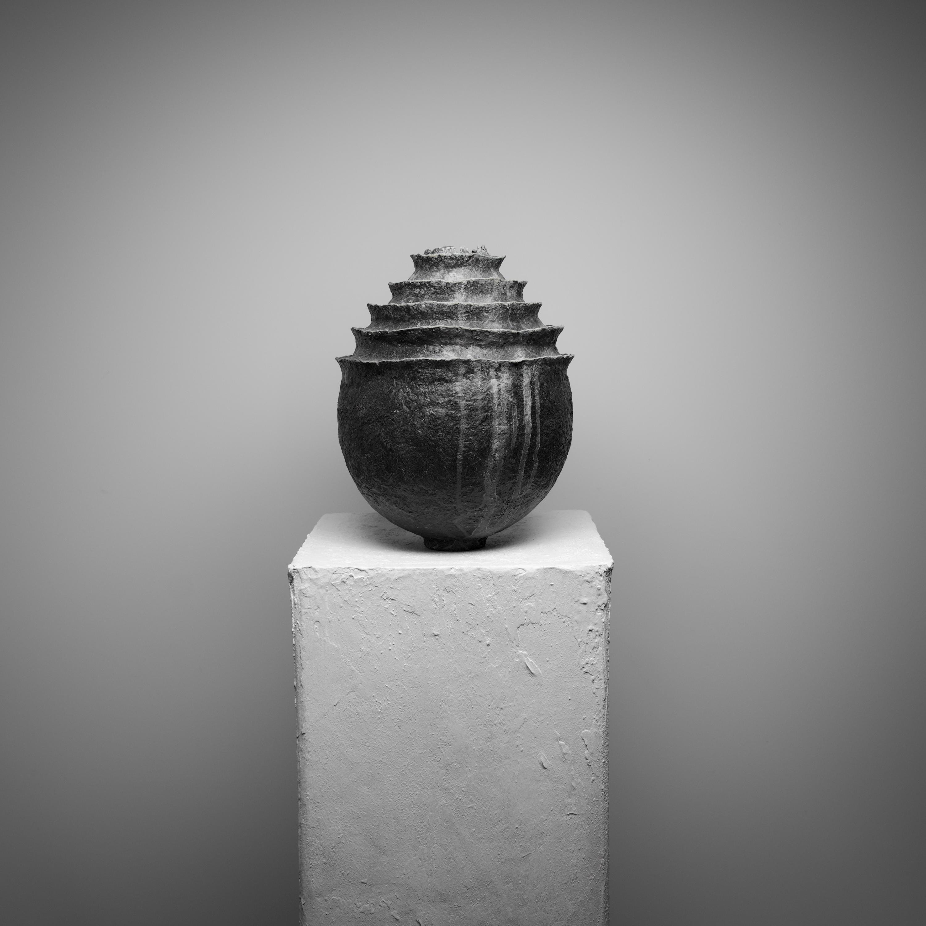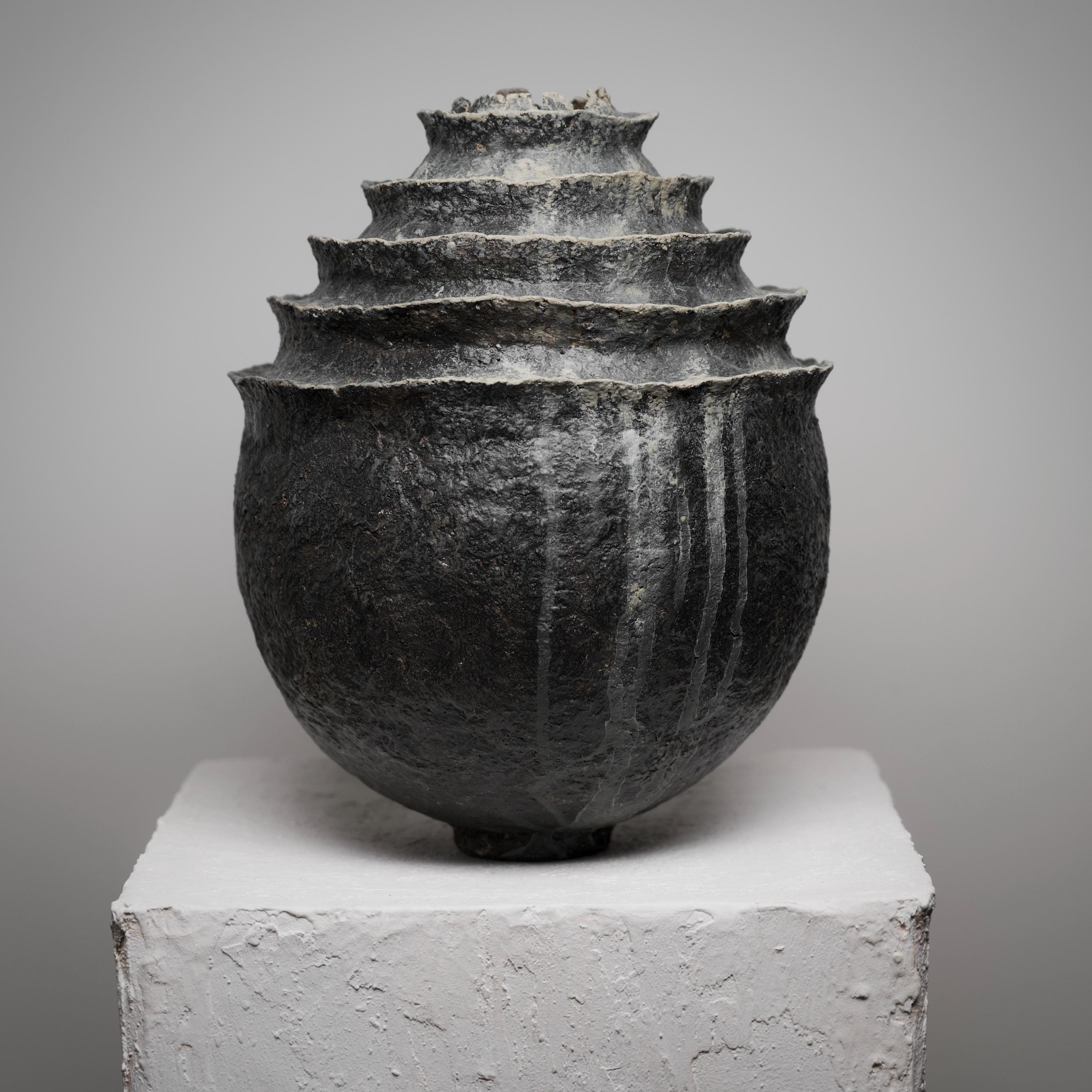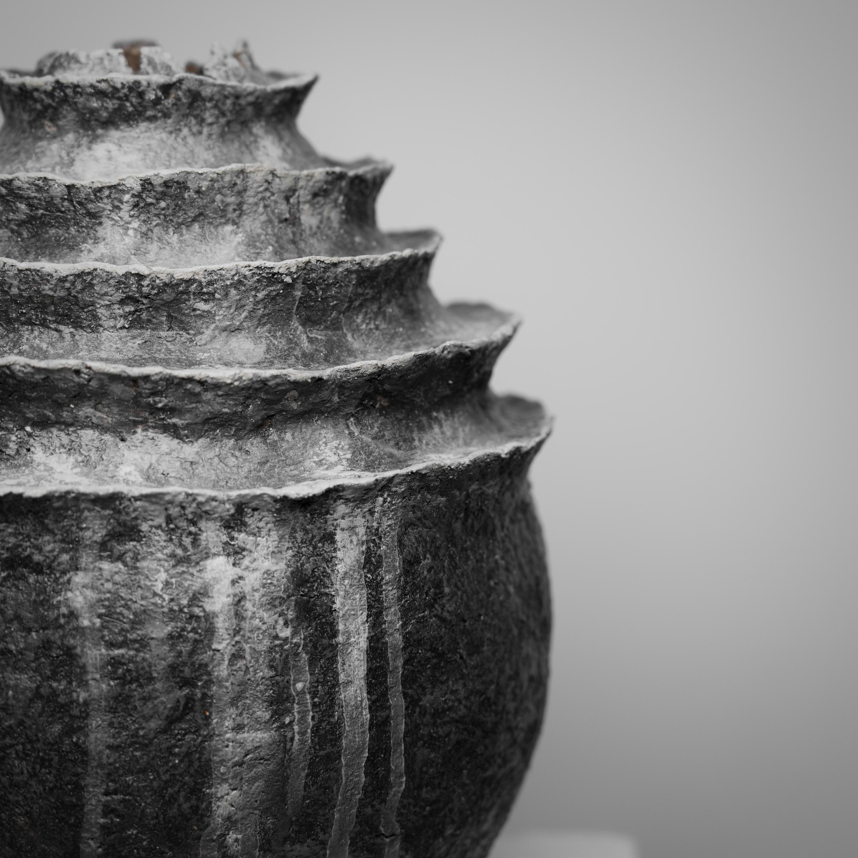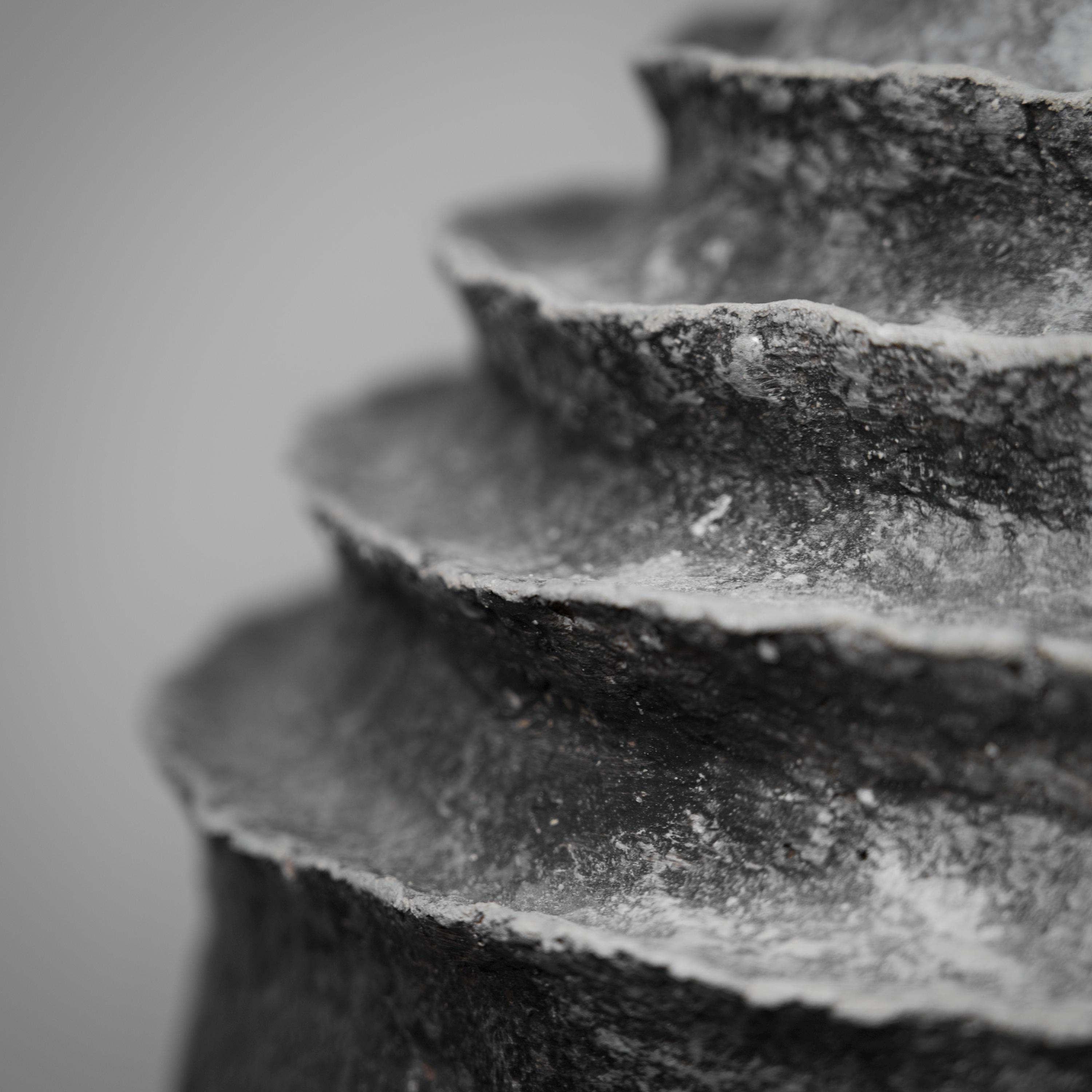 This sculptural vessel gathers time through rings and stepped layers formed directly by hand.