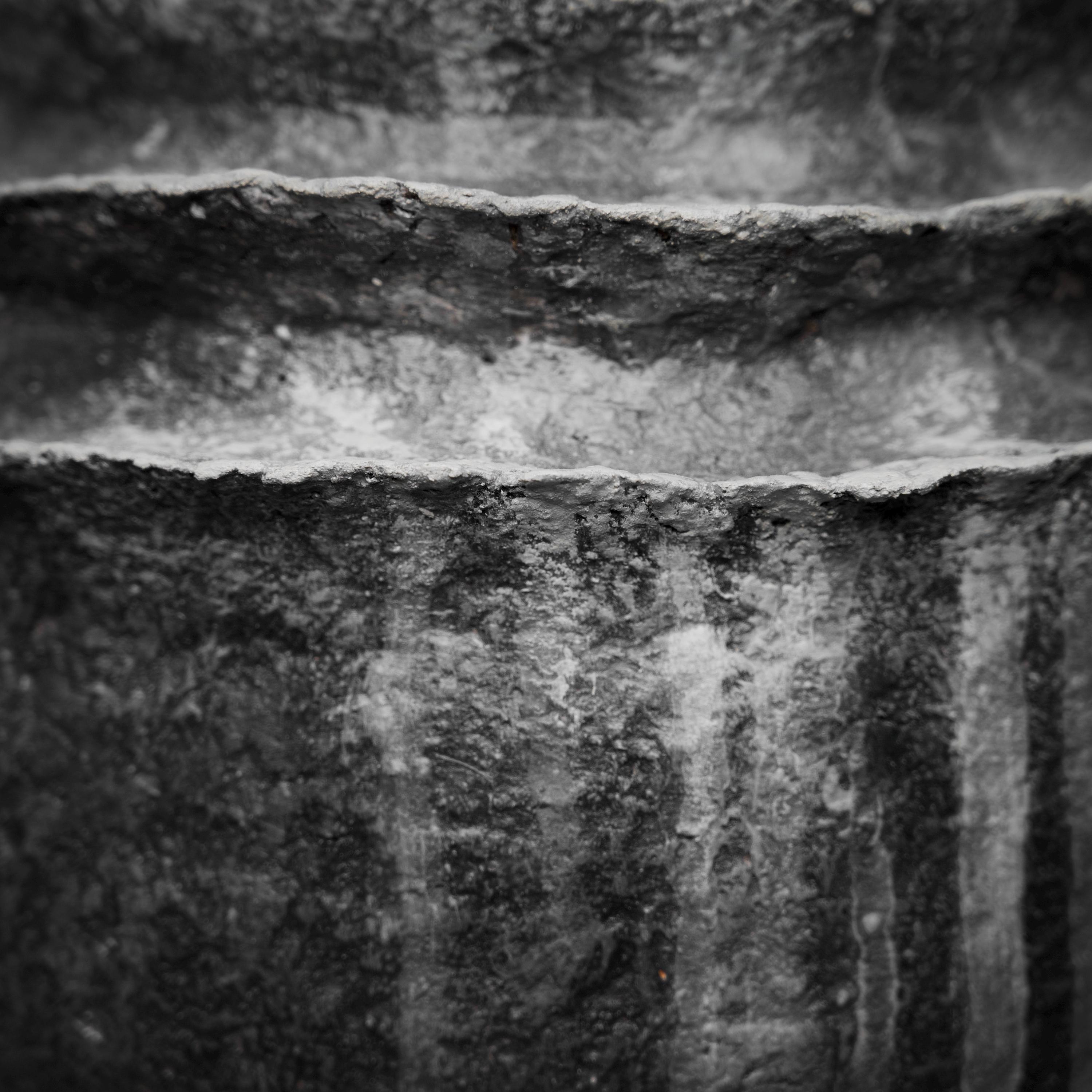 Color shifts subtly with light, moving between mineral black, ash, and muted stone tones.
