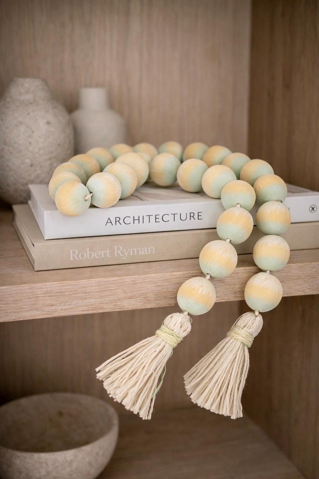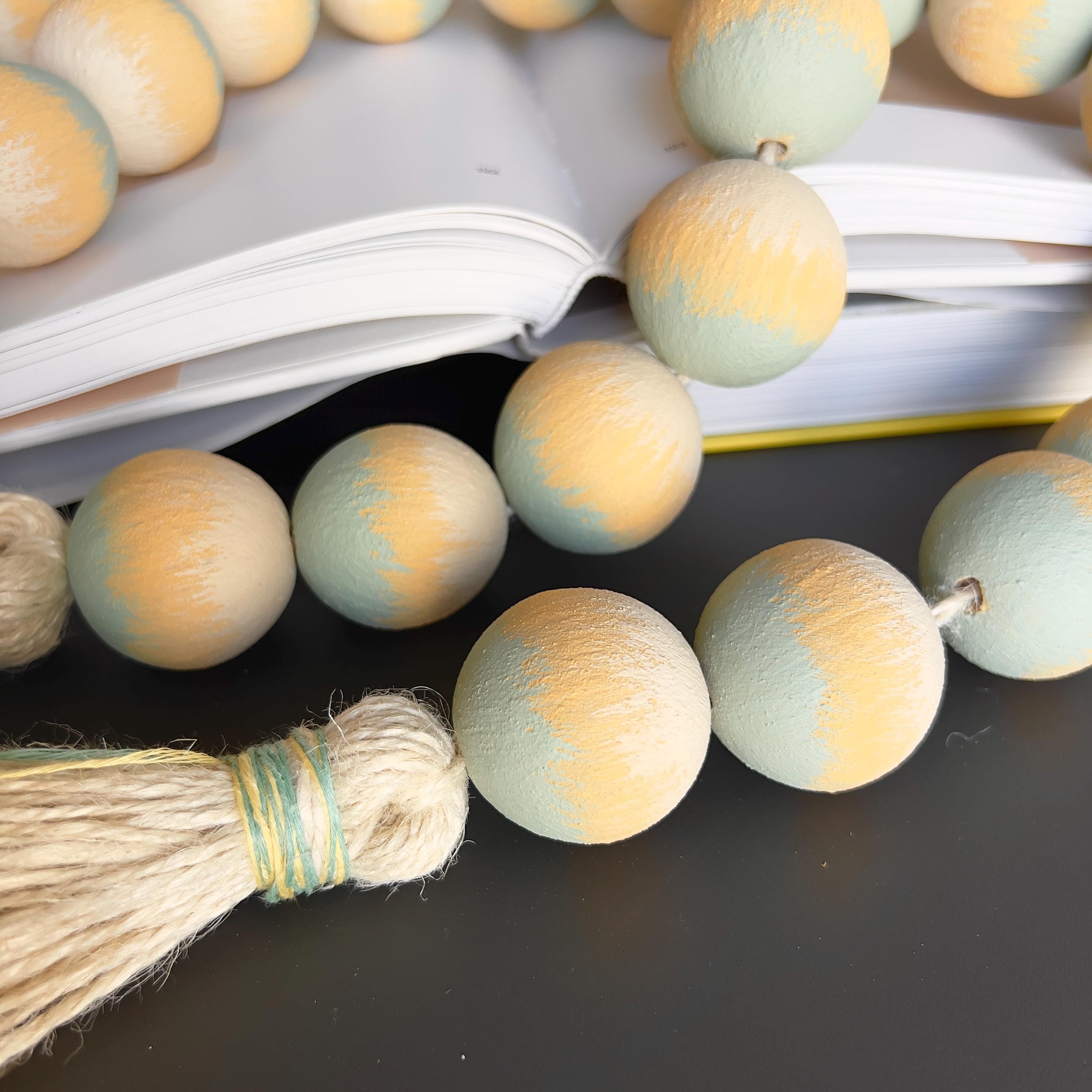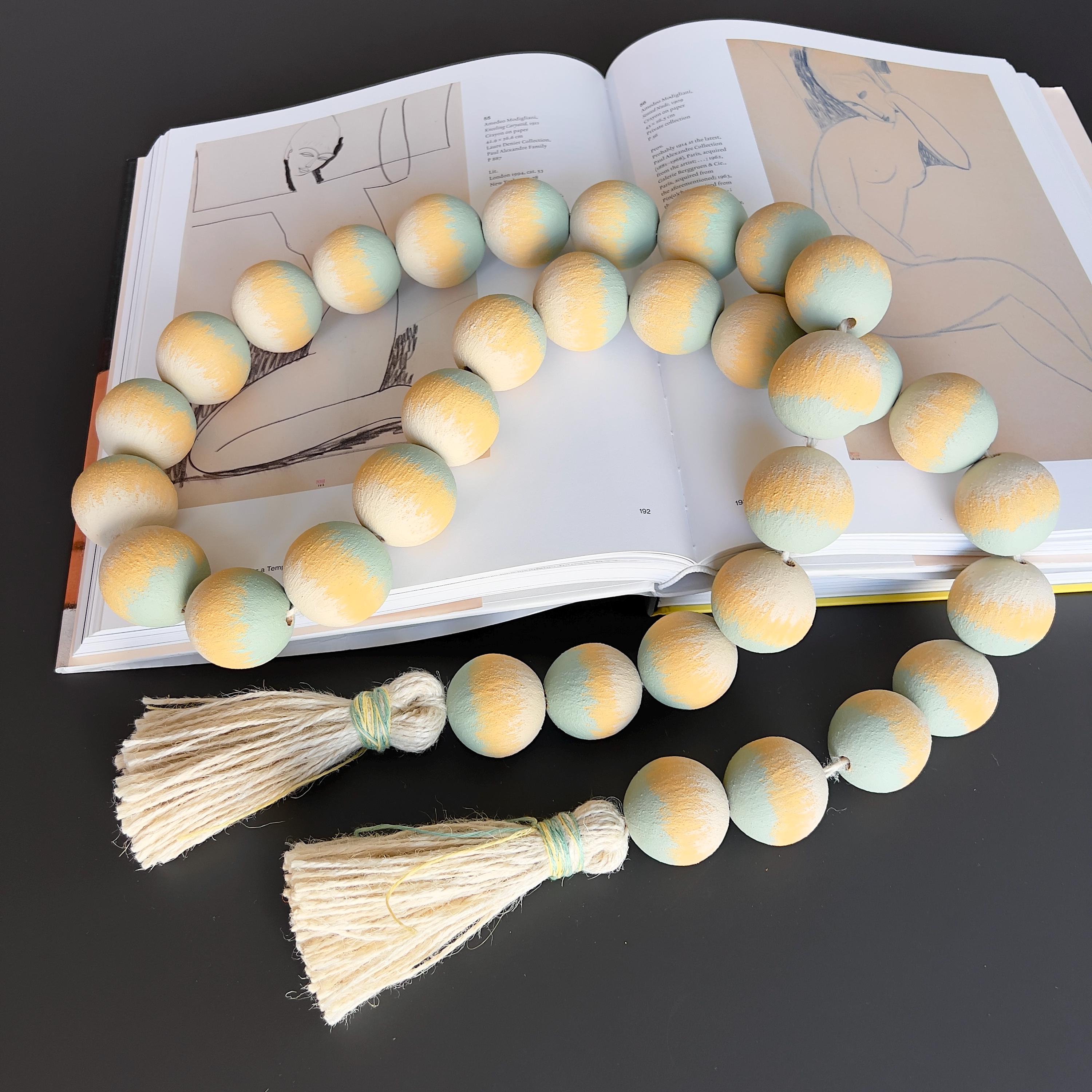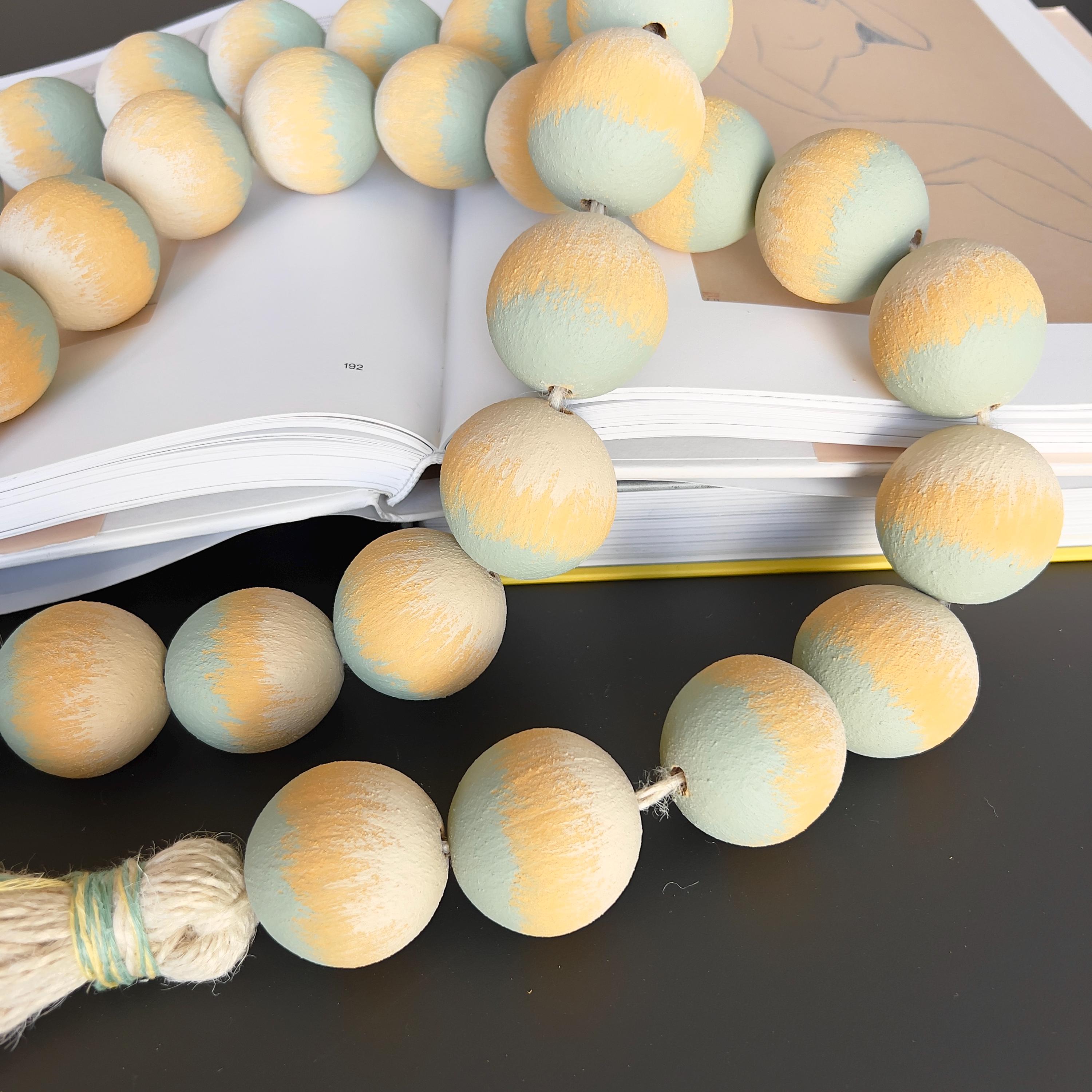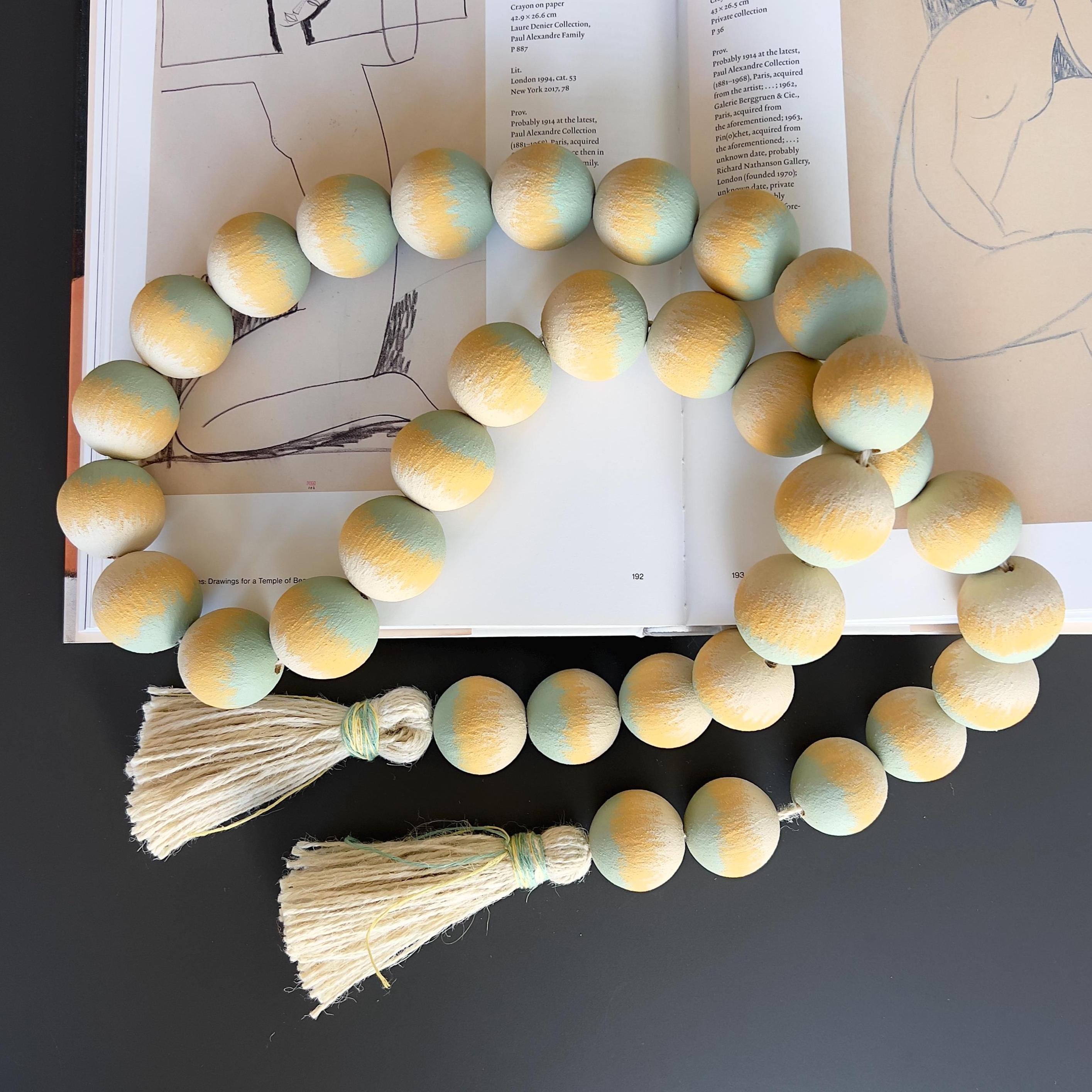 Large wood beads garland with tassel in soft neutral tones, hand painted and finished matte. Scandinavian decor accent for shelves, coffee tables, consoles, and calm modern interiors.