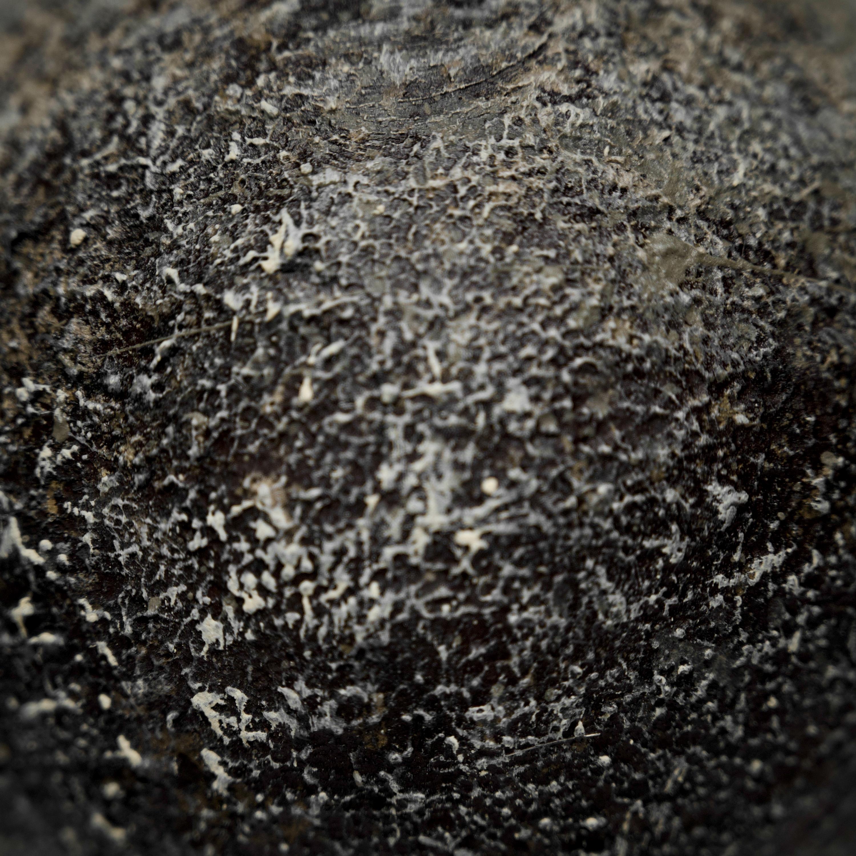 The hand-shaped surface reveals layers formed by accumulation and abrasion, creating an unrepeatable, tactile skin. Muted black and stone-toned textures shift subtly with light, preserving visible traces of material memory.