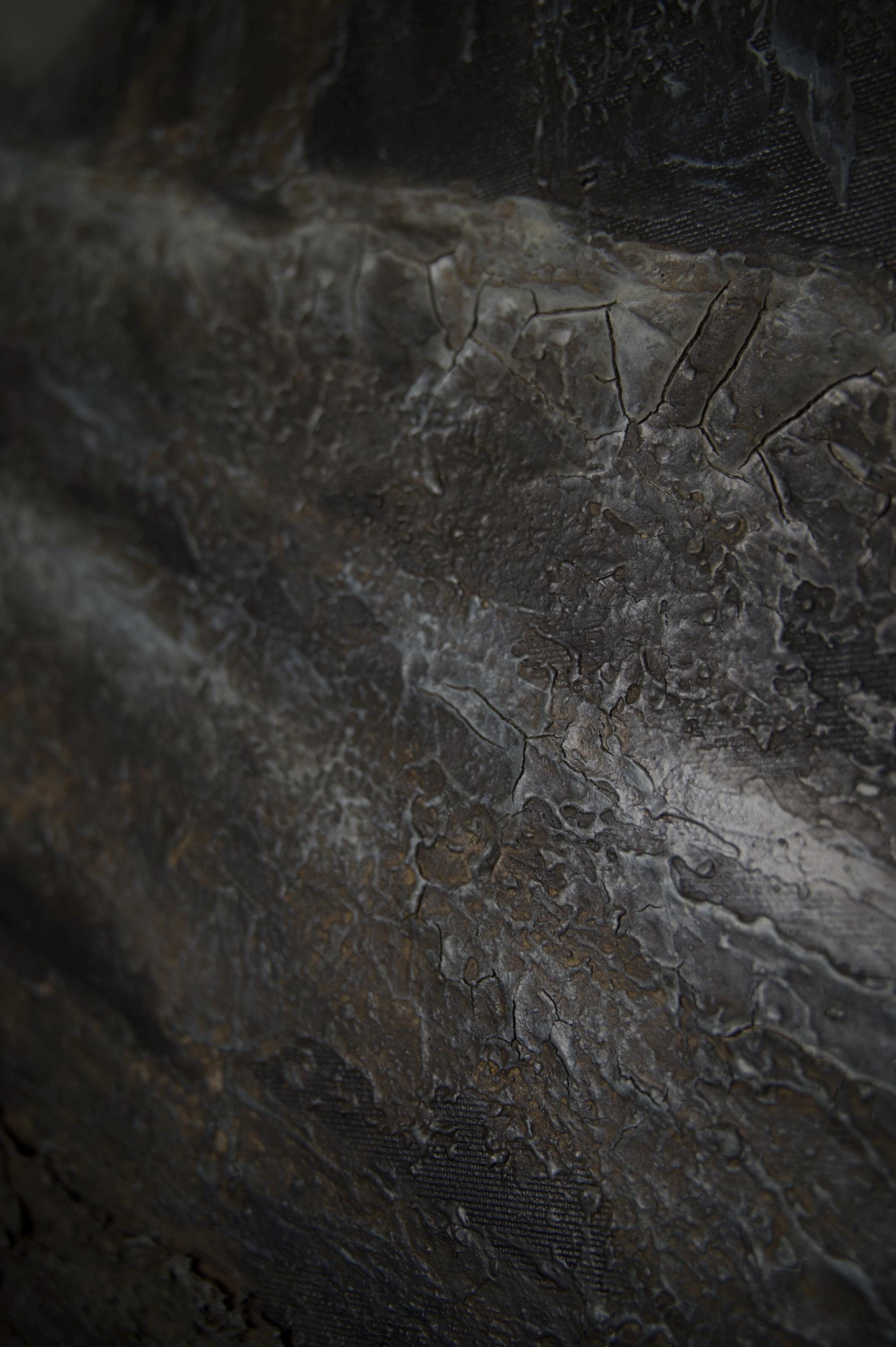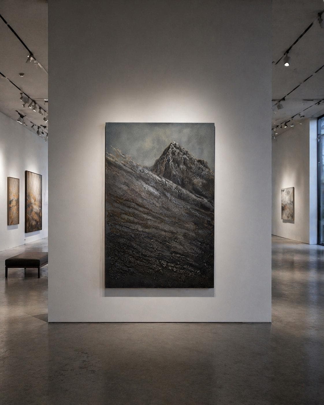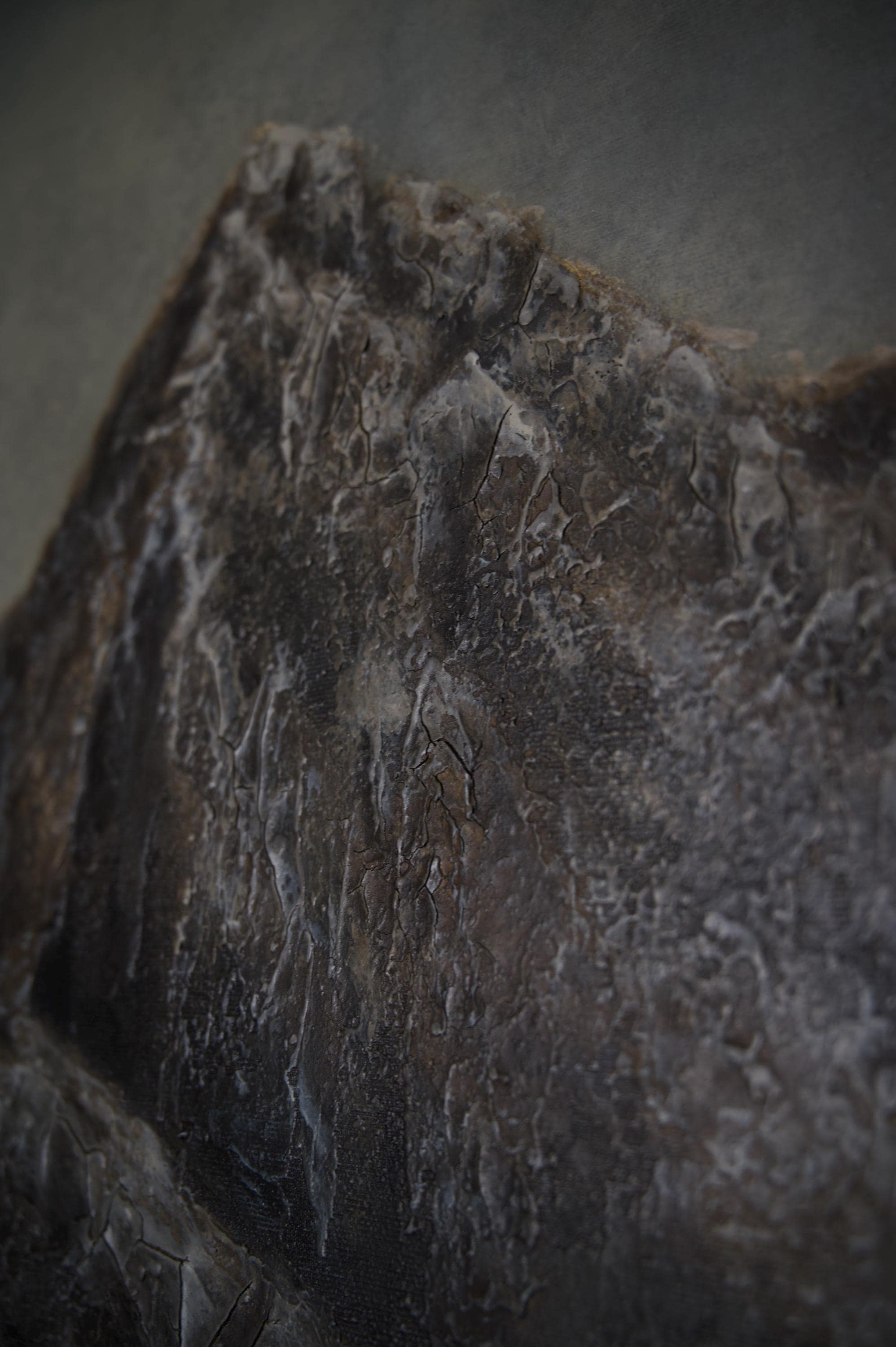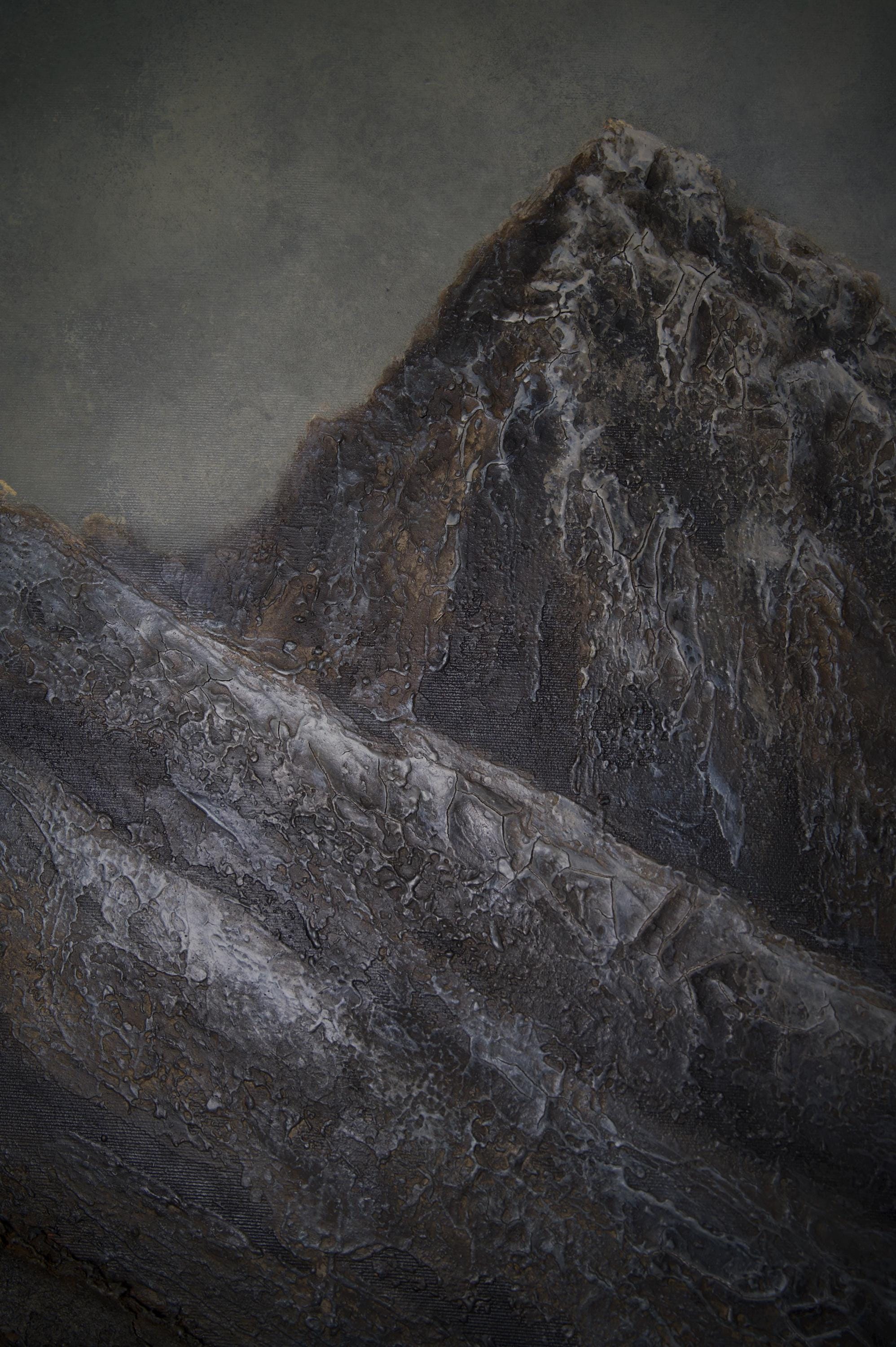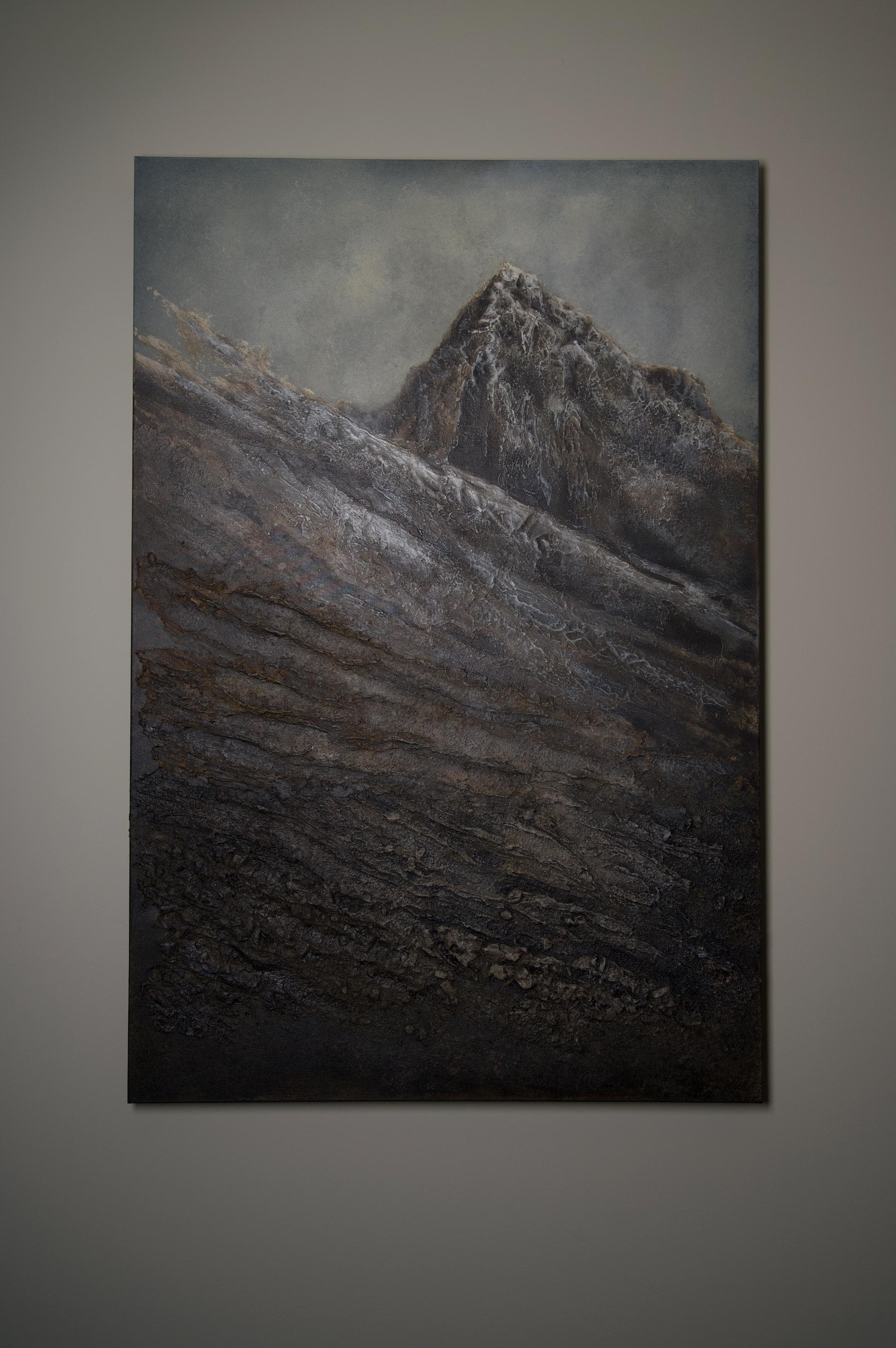 A mountain form emerges — ridges, erosion, and geological mass held within the surface. Cracks and transitions remain visible, carrying weight and continuity. The work holds both tension and stillness, shifting between landscape and abstraction.