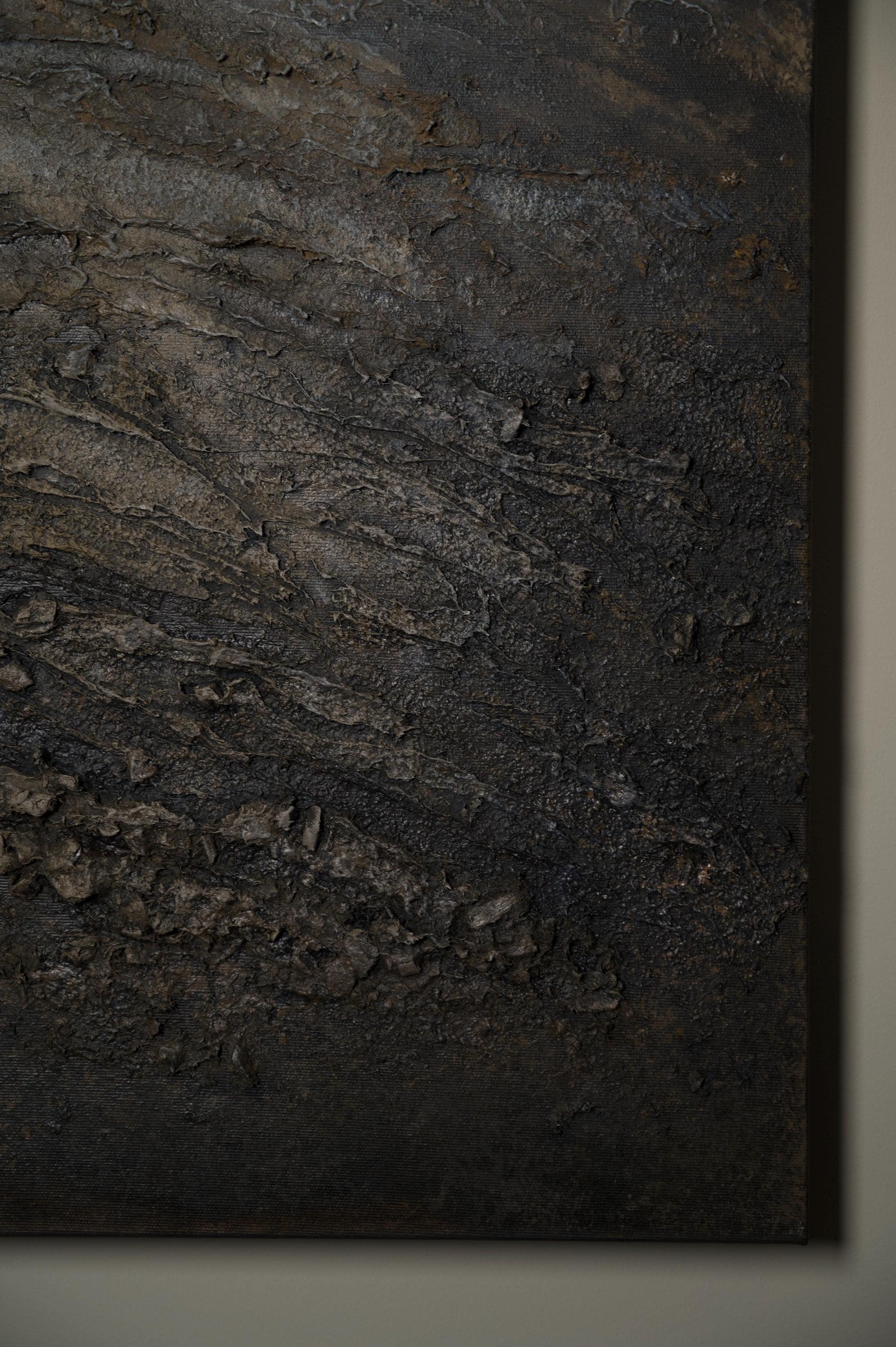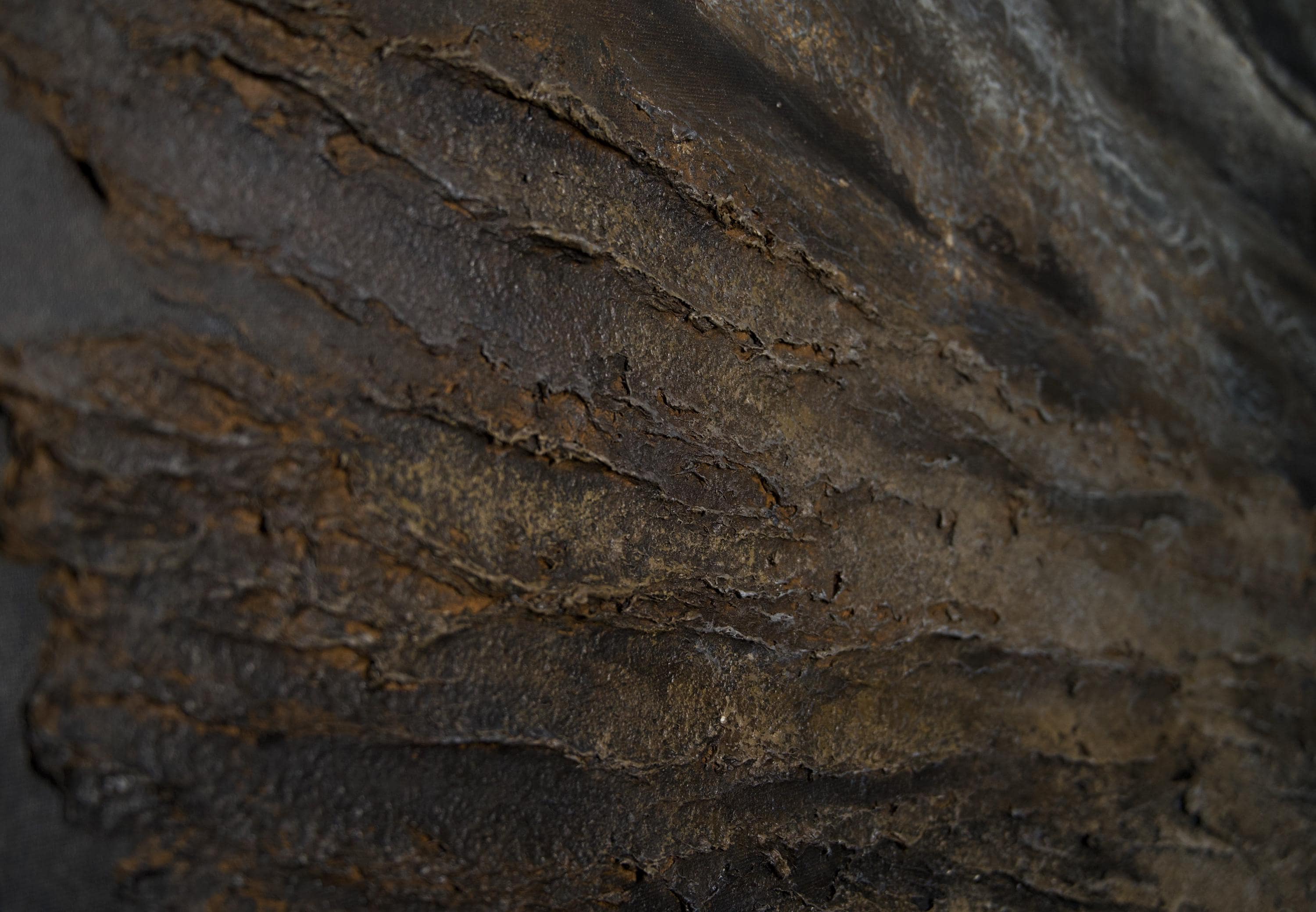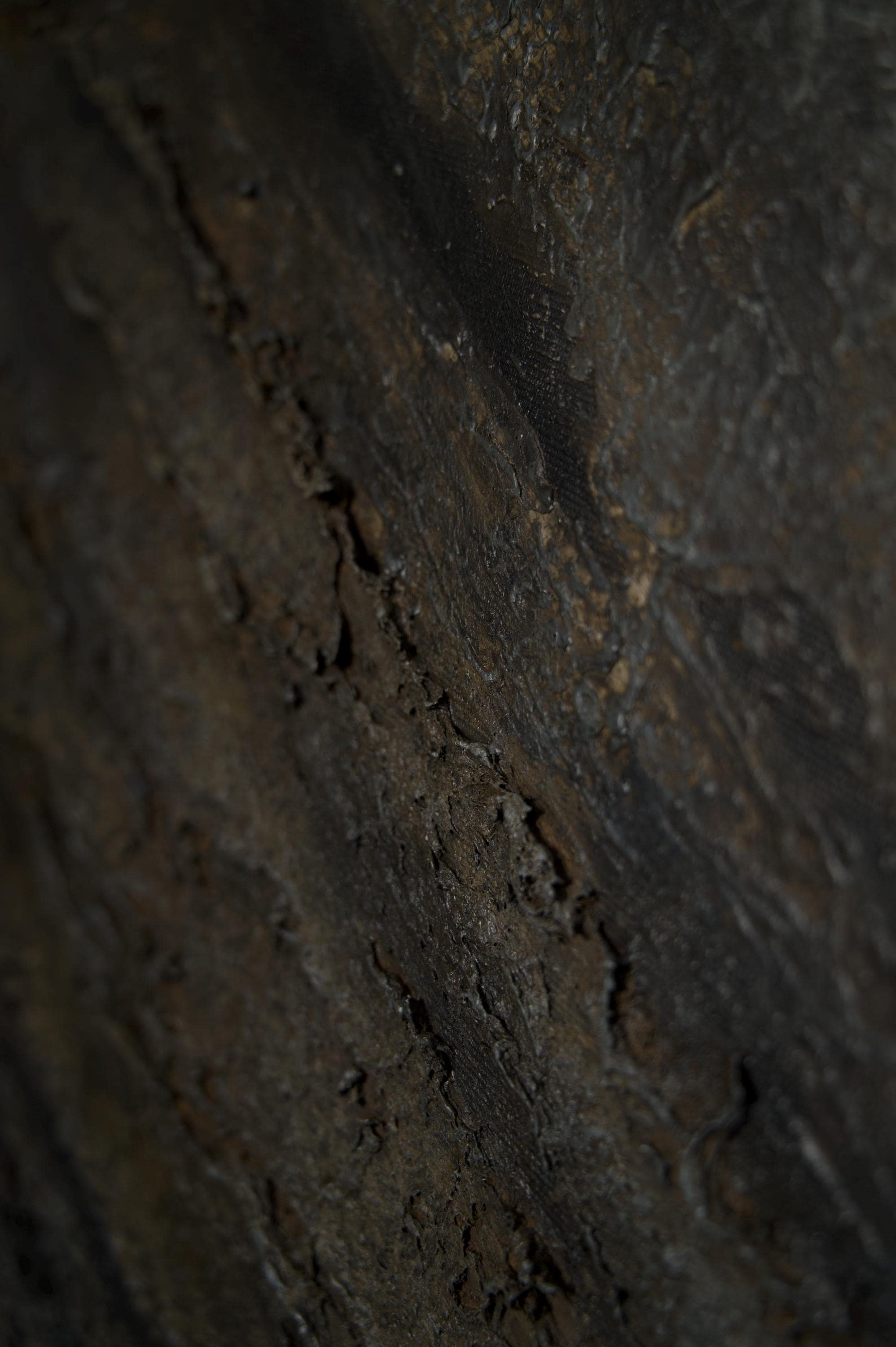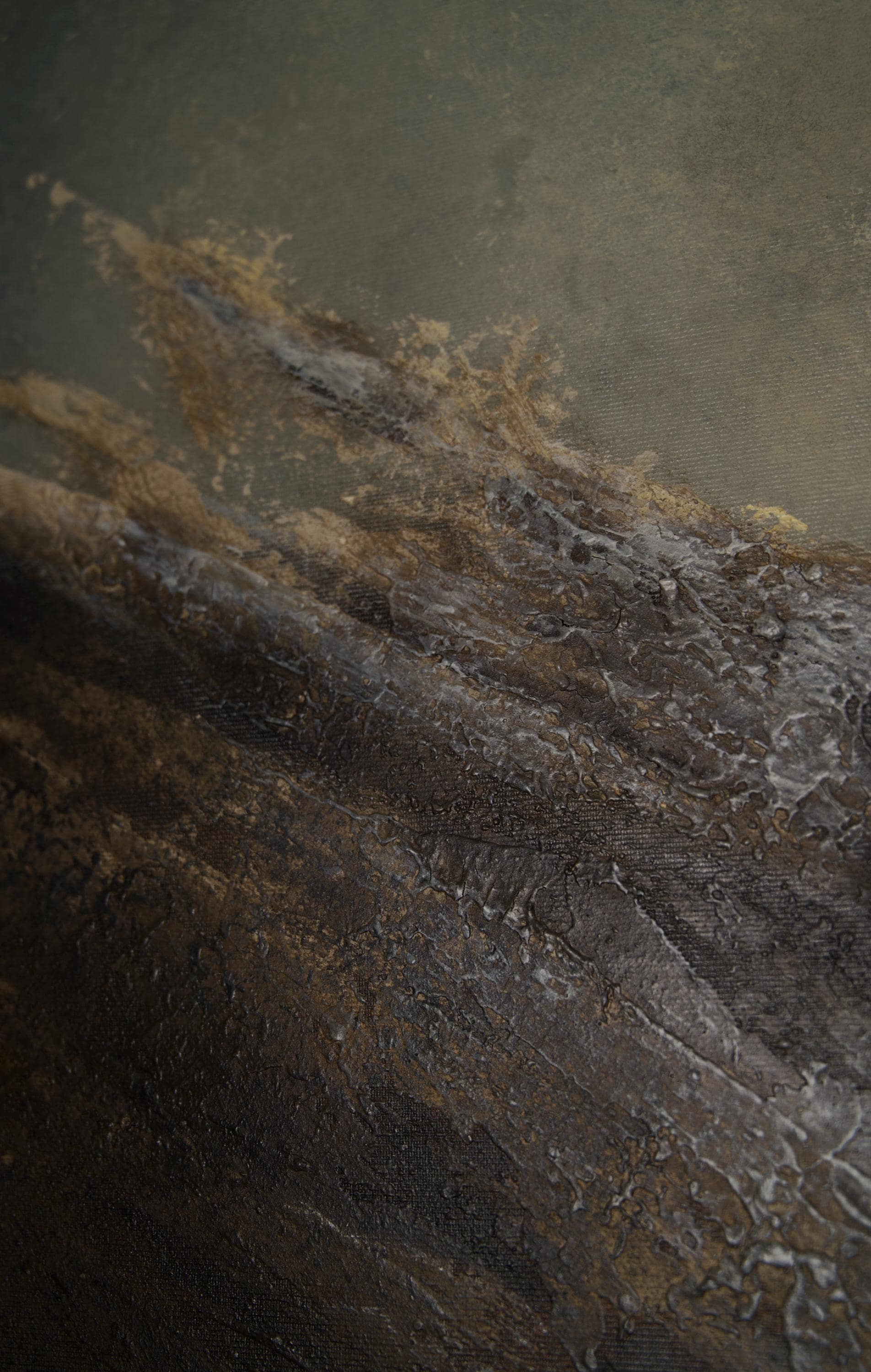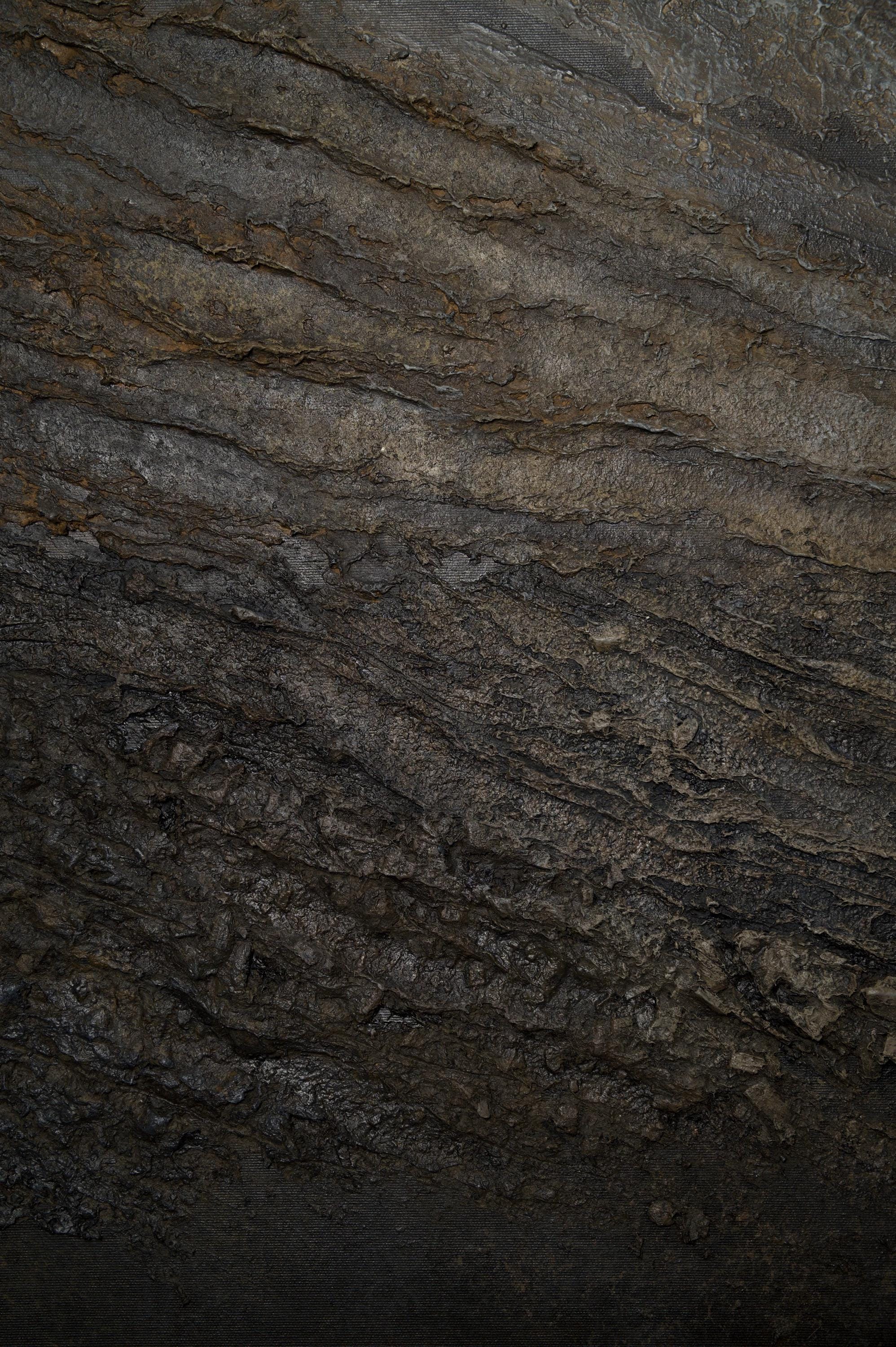 A mountain form emerges — ridges, erosion, and geological mass held within the surface. Cracks and transitions remain visible, carrying weight and continuity. The work holds both tension and stillness, shifting between landscape and abstraction.
