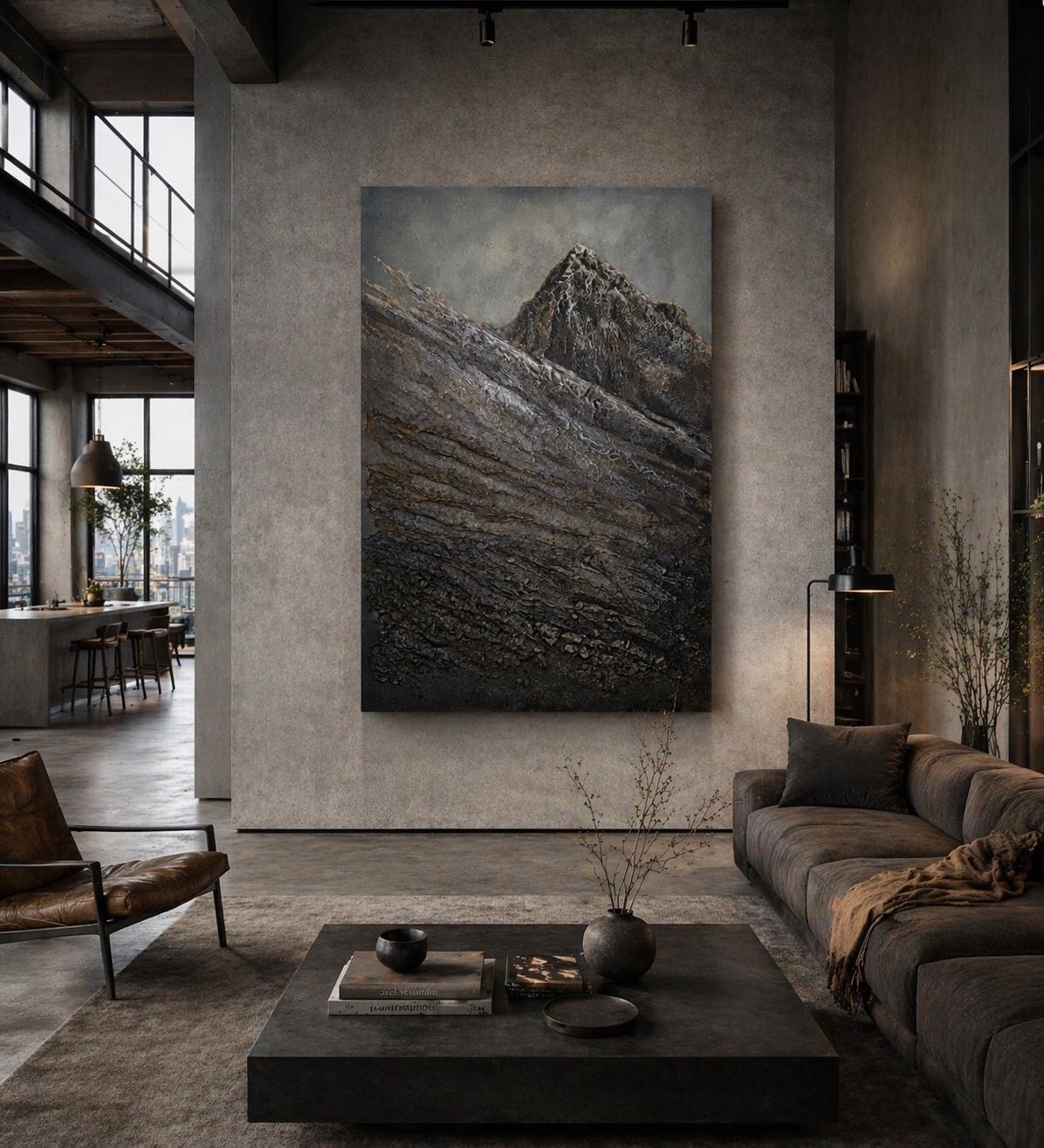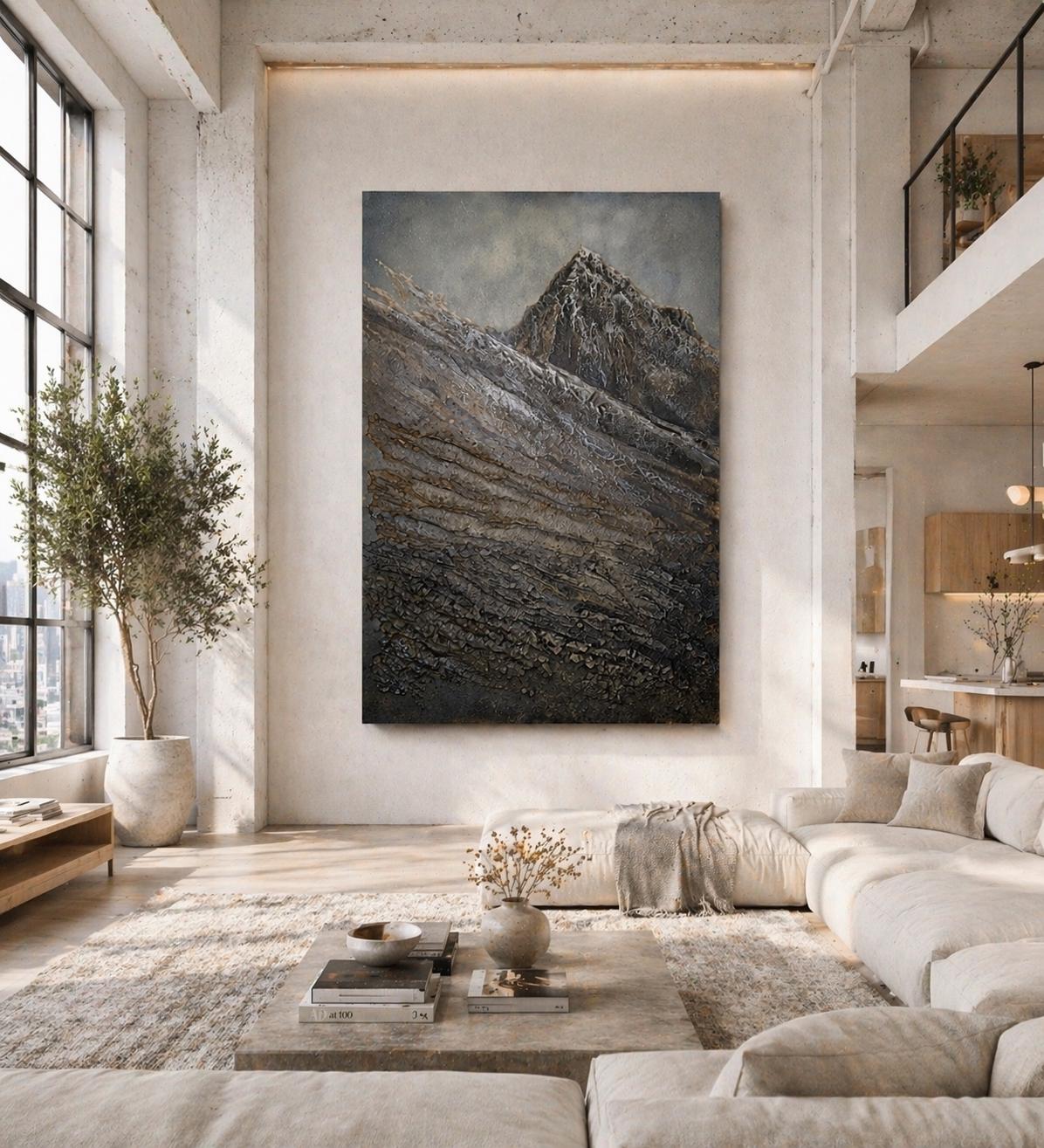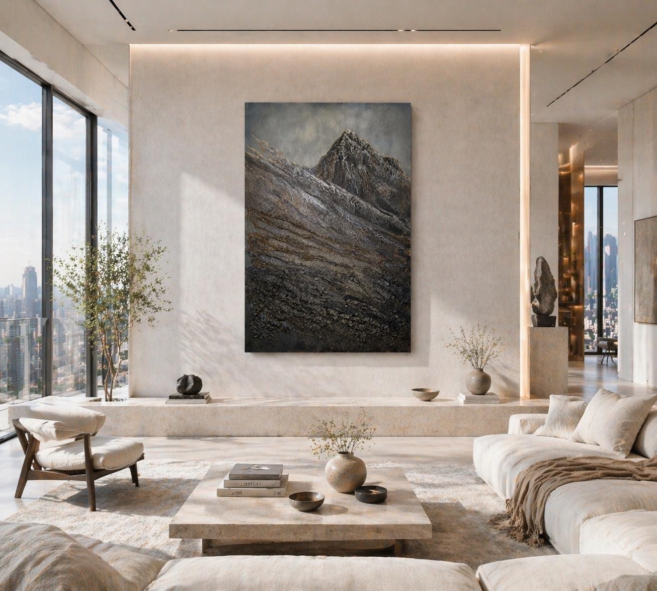 Textured mountain wall art in natural earth tones, sculptural abstract painting with deep tactile surface. A statement piece for modern neutral interiors, collectors, and organic contemporary spaces.