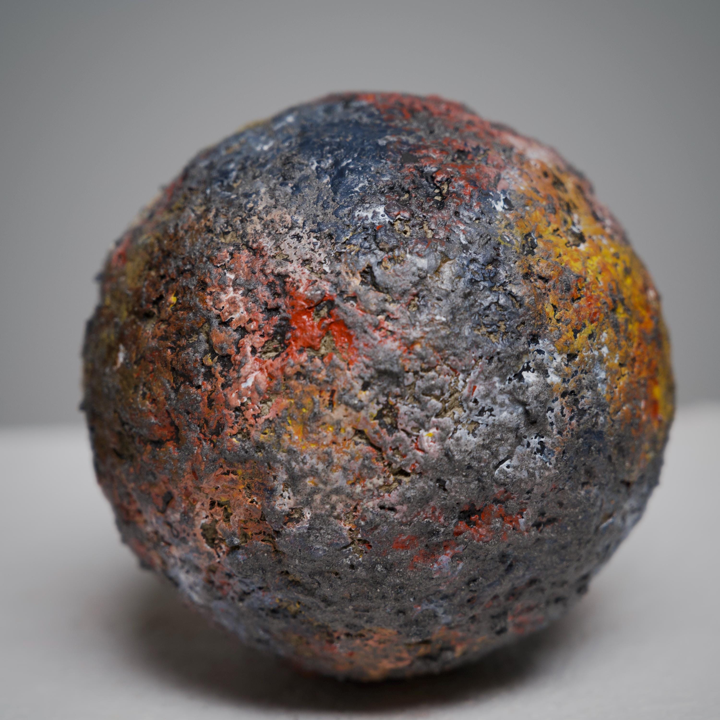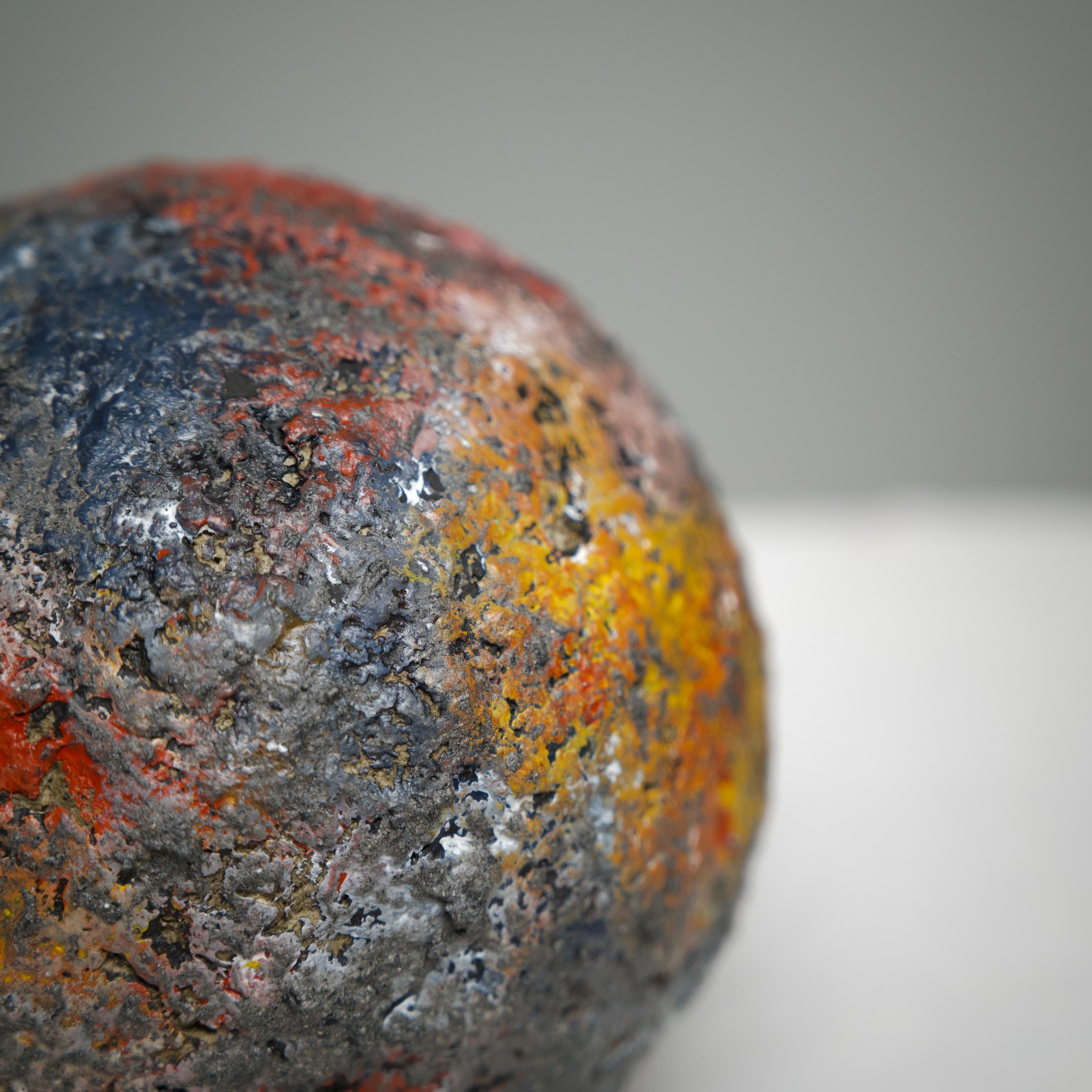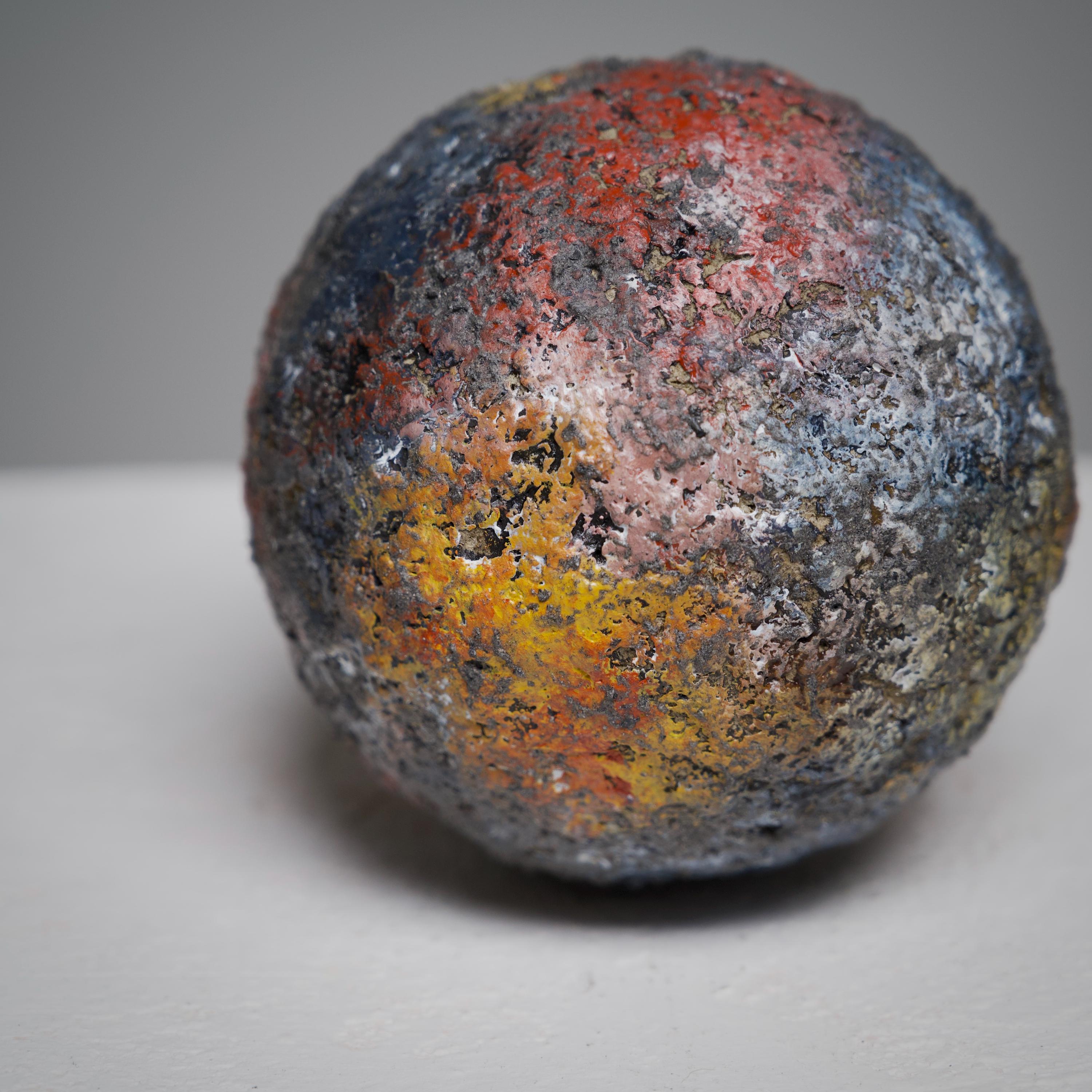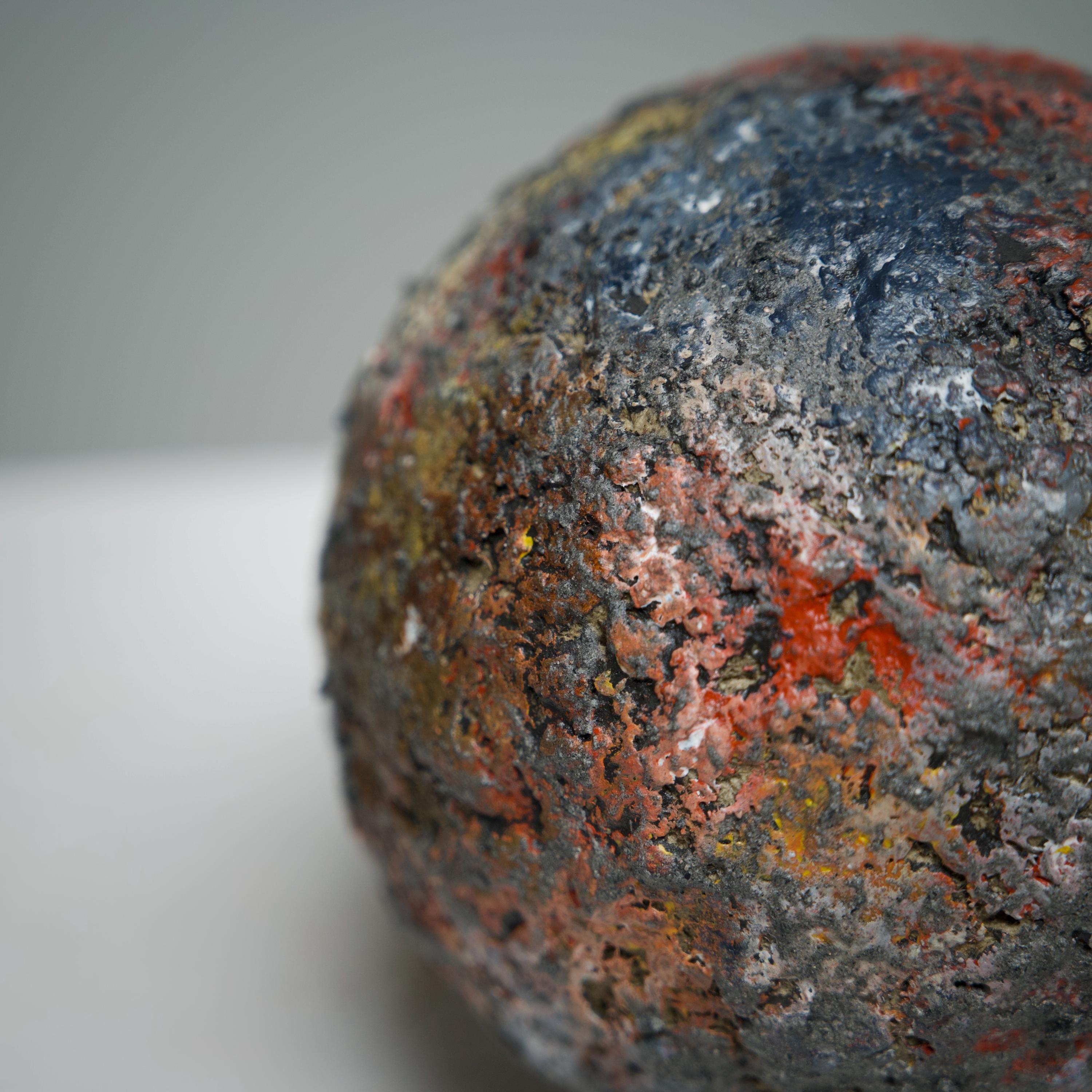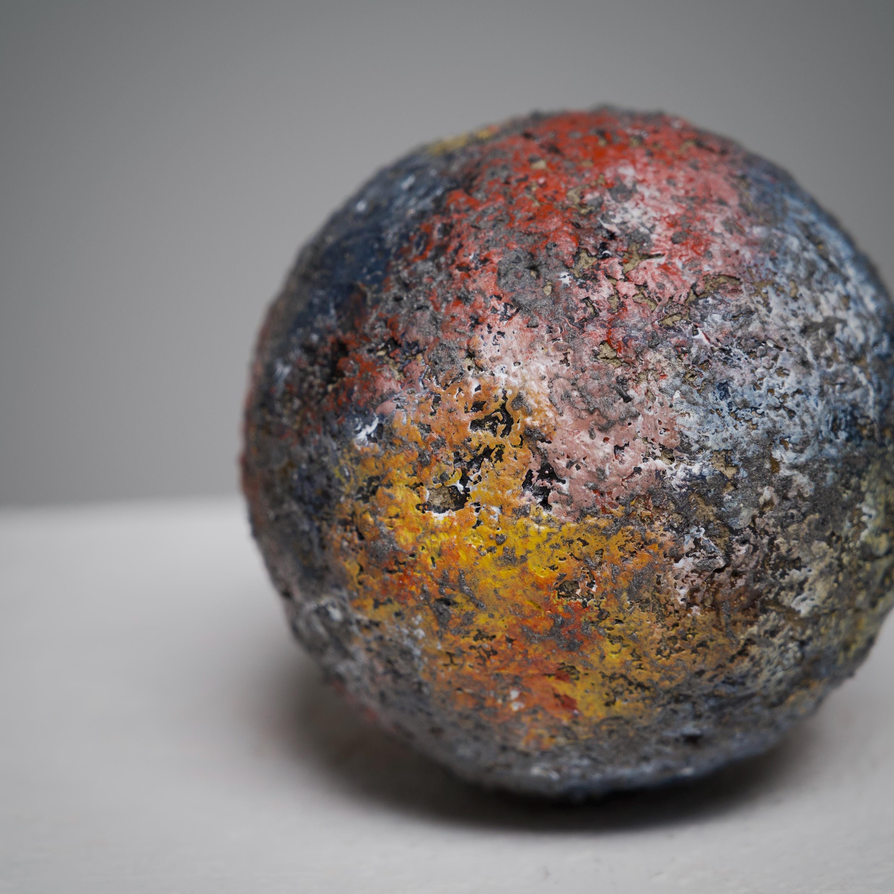 Textured sphere sculpture in earthy tones. Handmade paper clay art object for wabi sabi, japandi, and modern interiors. Compact sculptural accent with raw mineral surface.