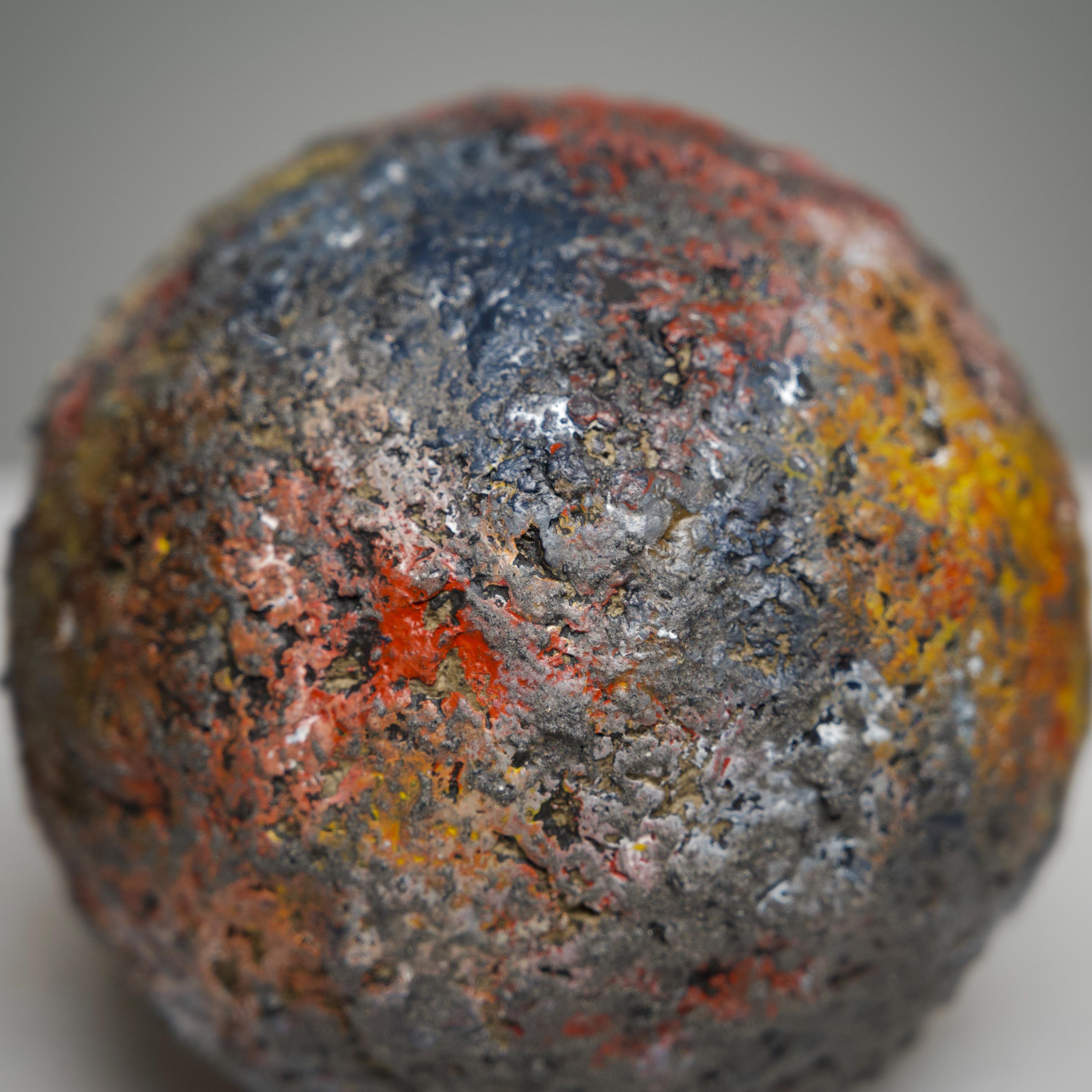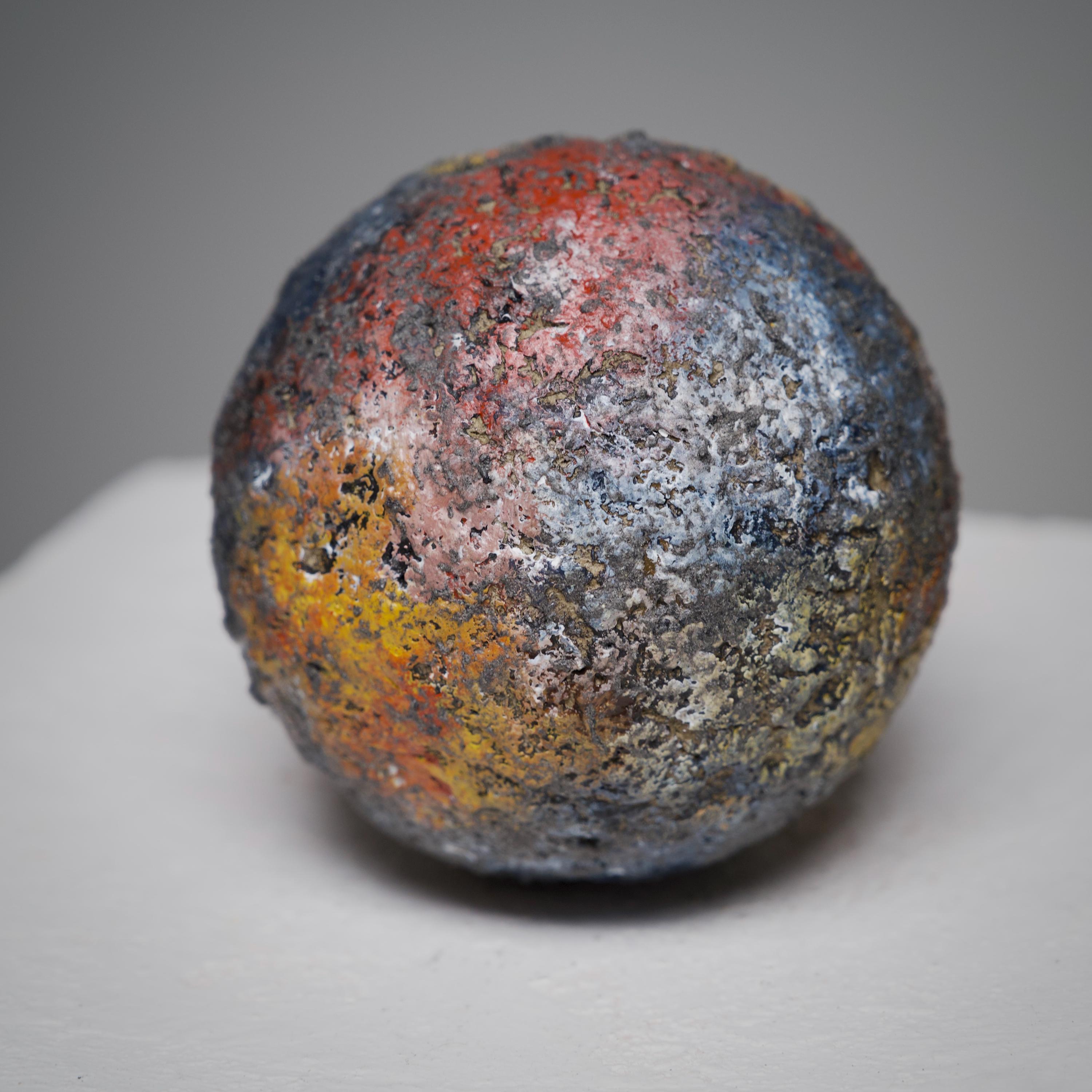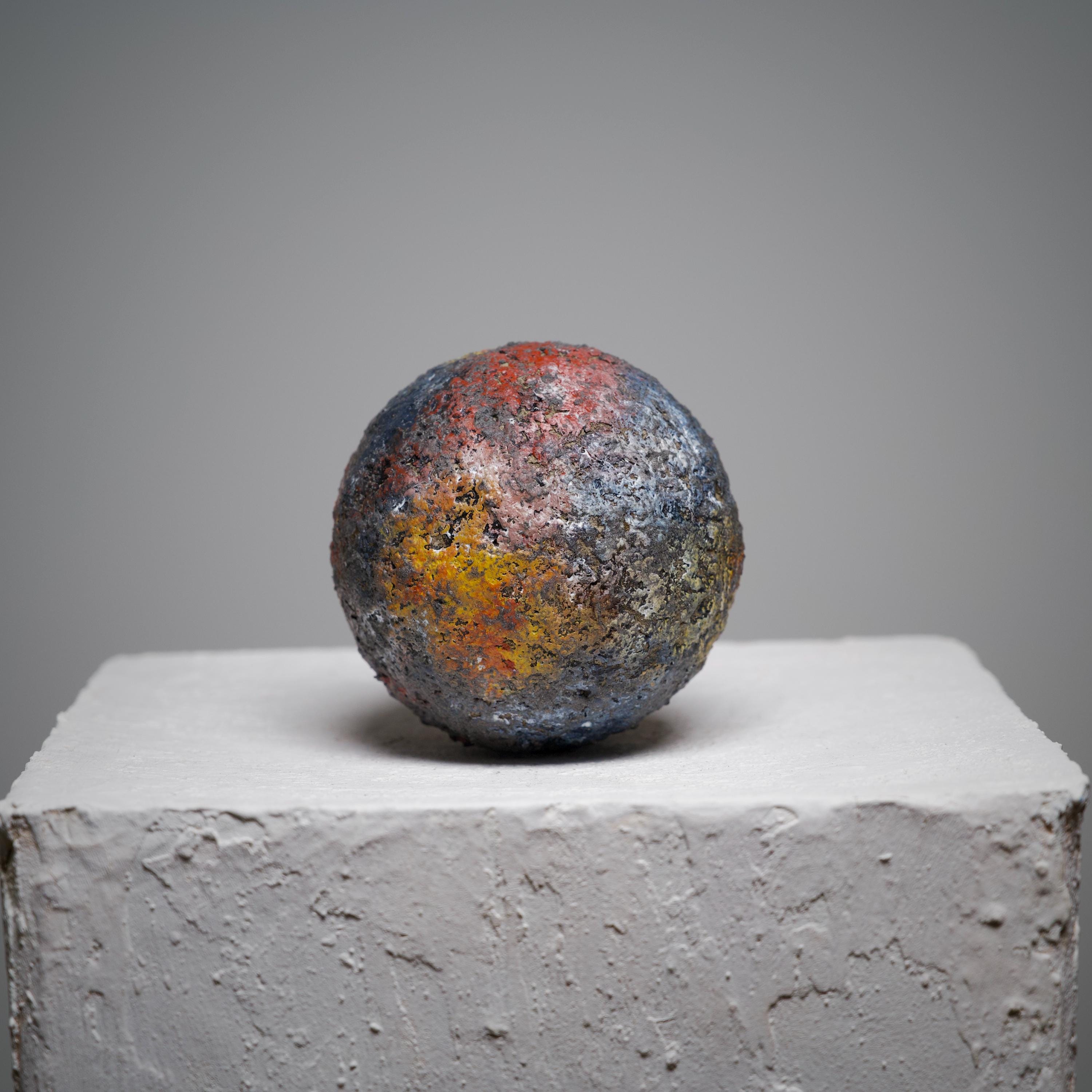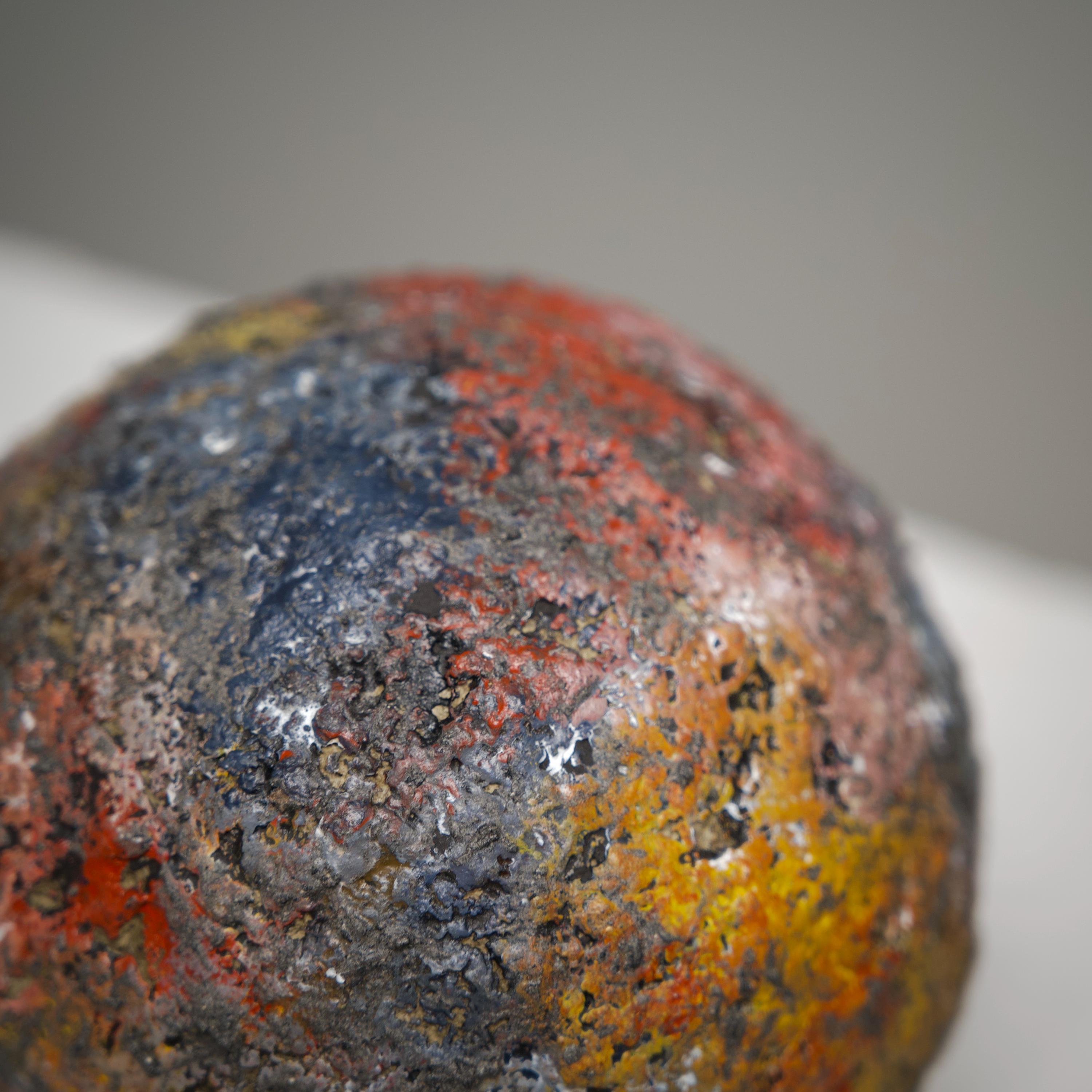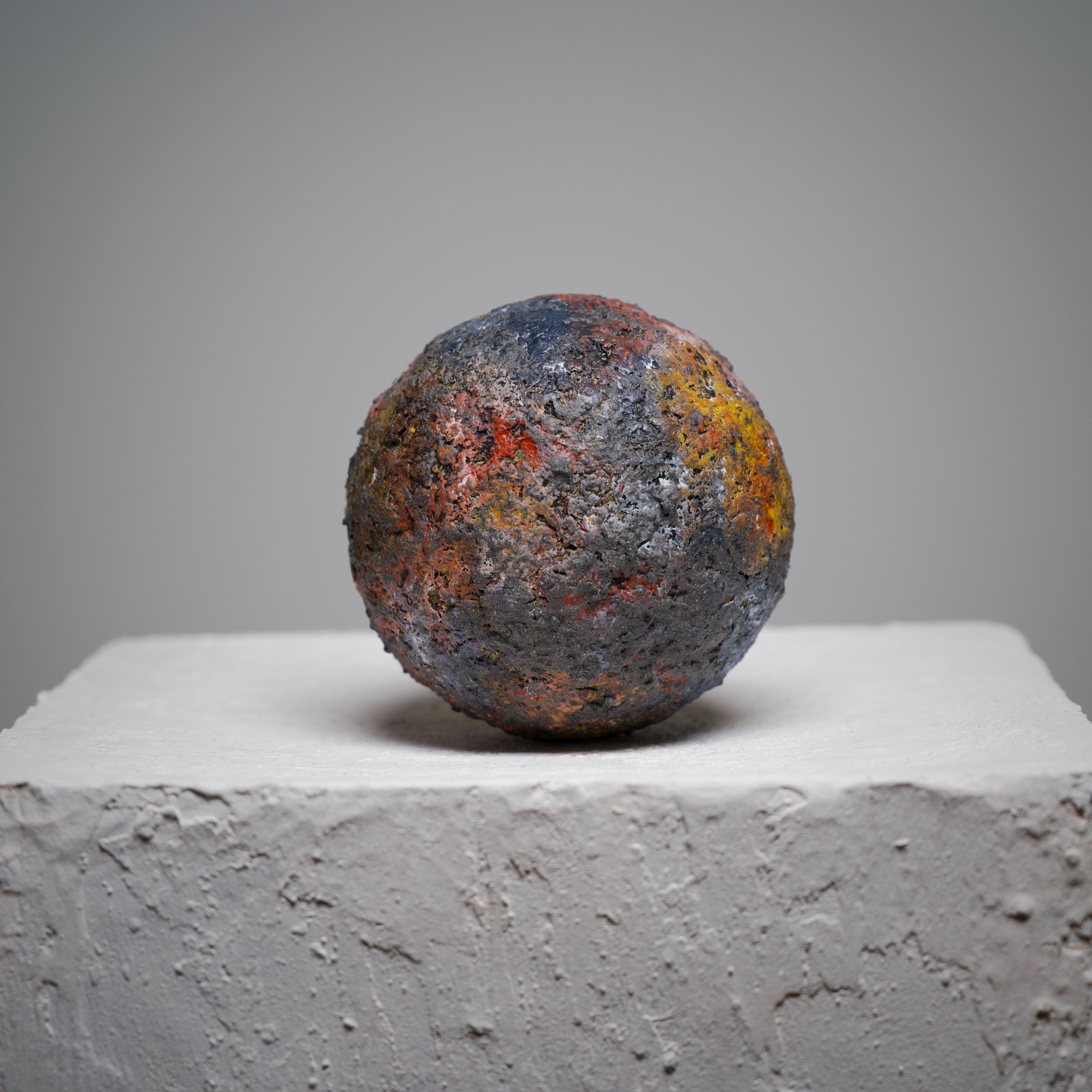 Textured sphere sculpture in earthy tones. Handmade paper clay art object for wabi sabi, japandi, and modern interiors. Compact sculptural accent with raw mineral surface.